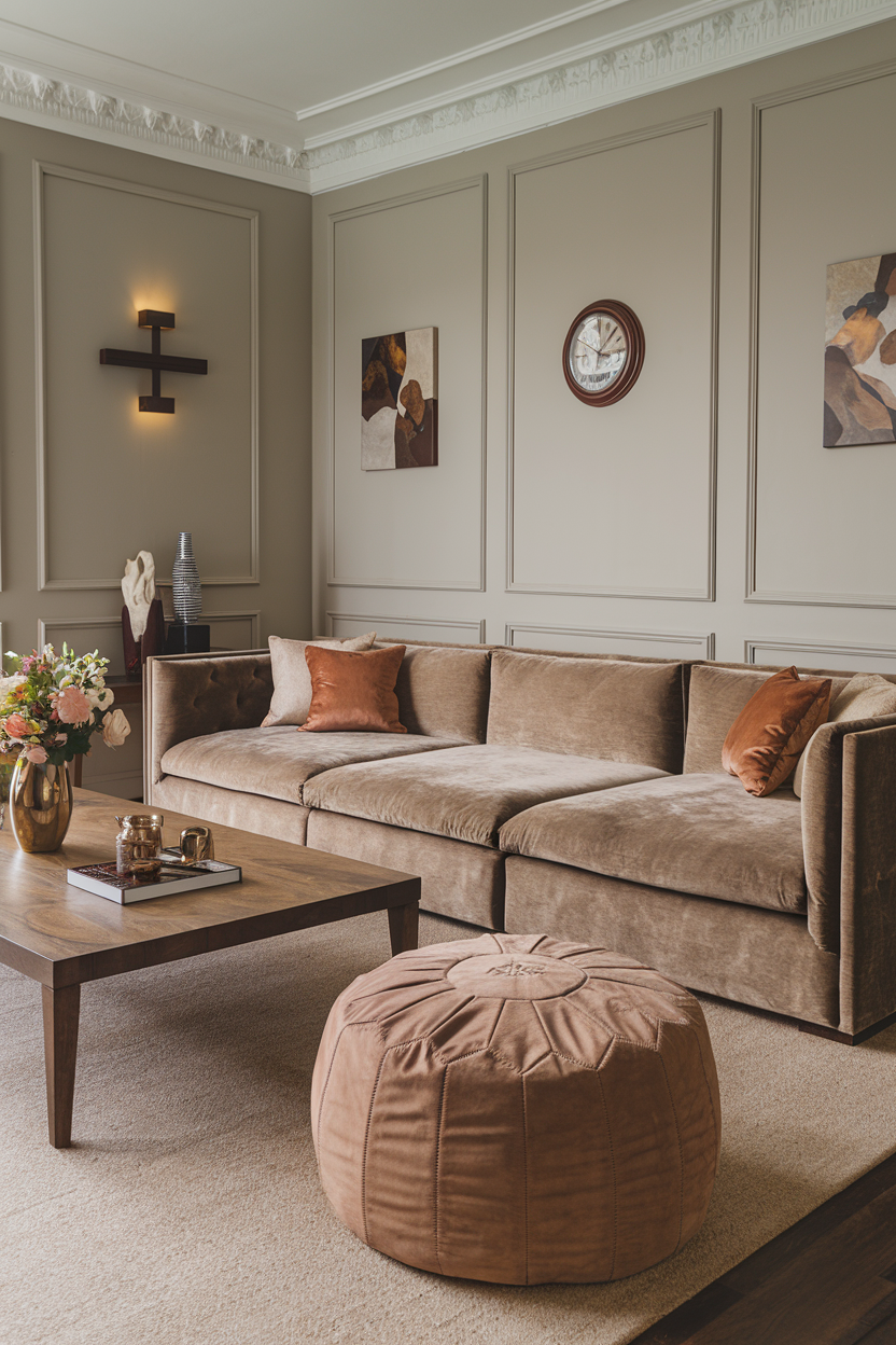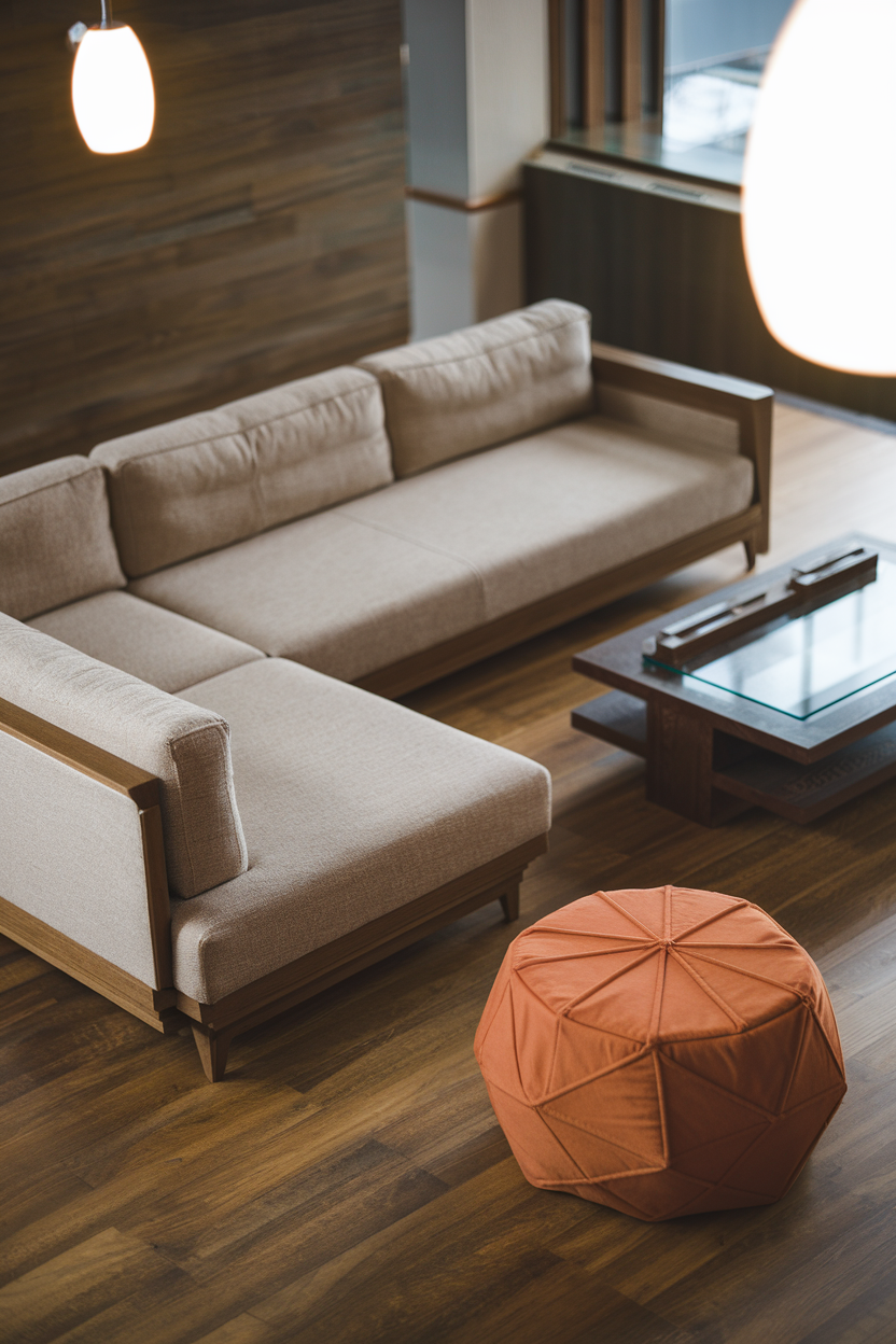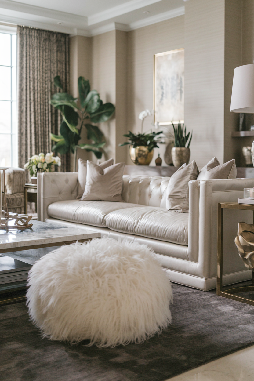 A suede pouf brings a soft, sophisticated touch to your living room. The smooth texture of suede combined with its luxurious appearance creates an elegant, high-end feel, making it a perfect complement to more refined or modern decor. Suede poufs often come in earthy tones like camel, taupe, or muted burgundy, allowing them to blend seamlessly into various color schemes. Its plush texture makes it a comfortable choice for use as a footrest or extra seating, while its sleek design ensures that it enhances the room’s overall aesthetic.