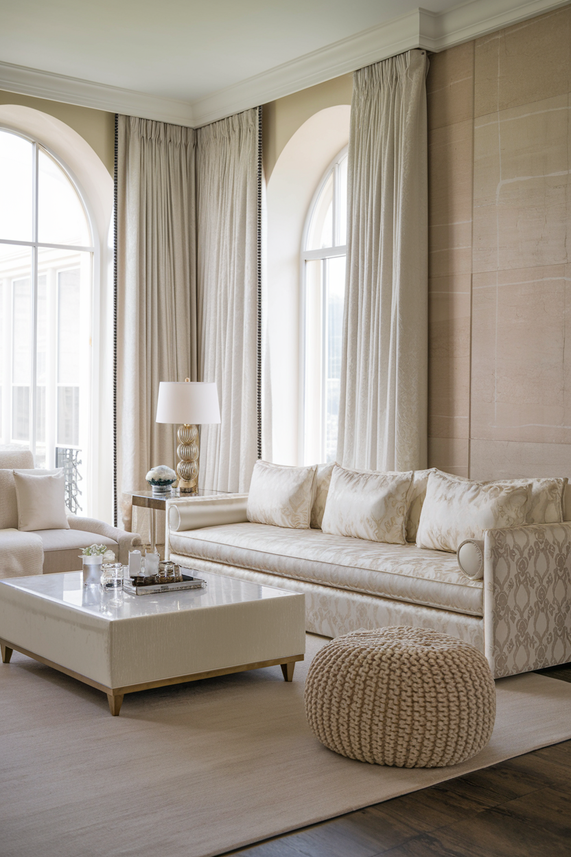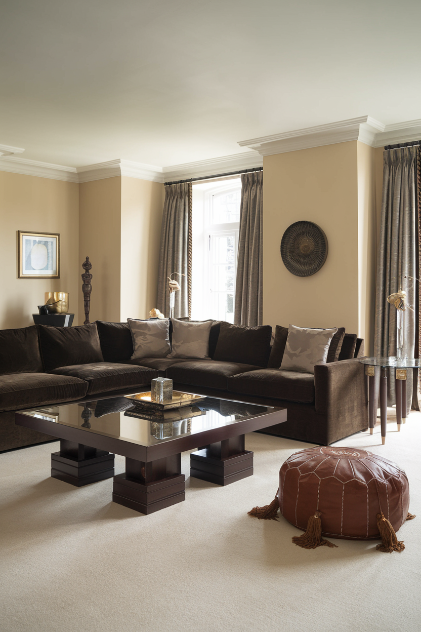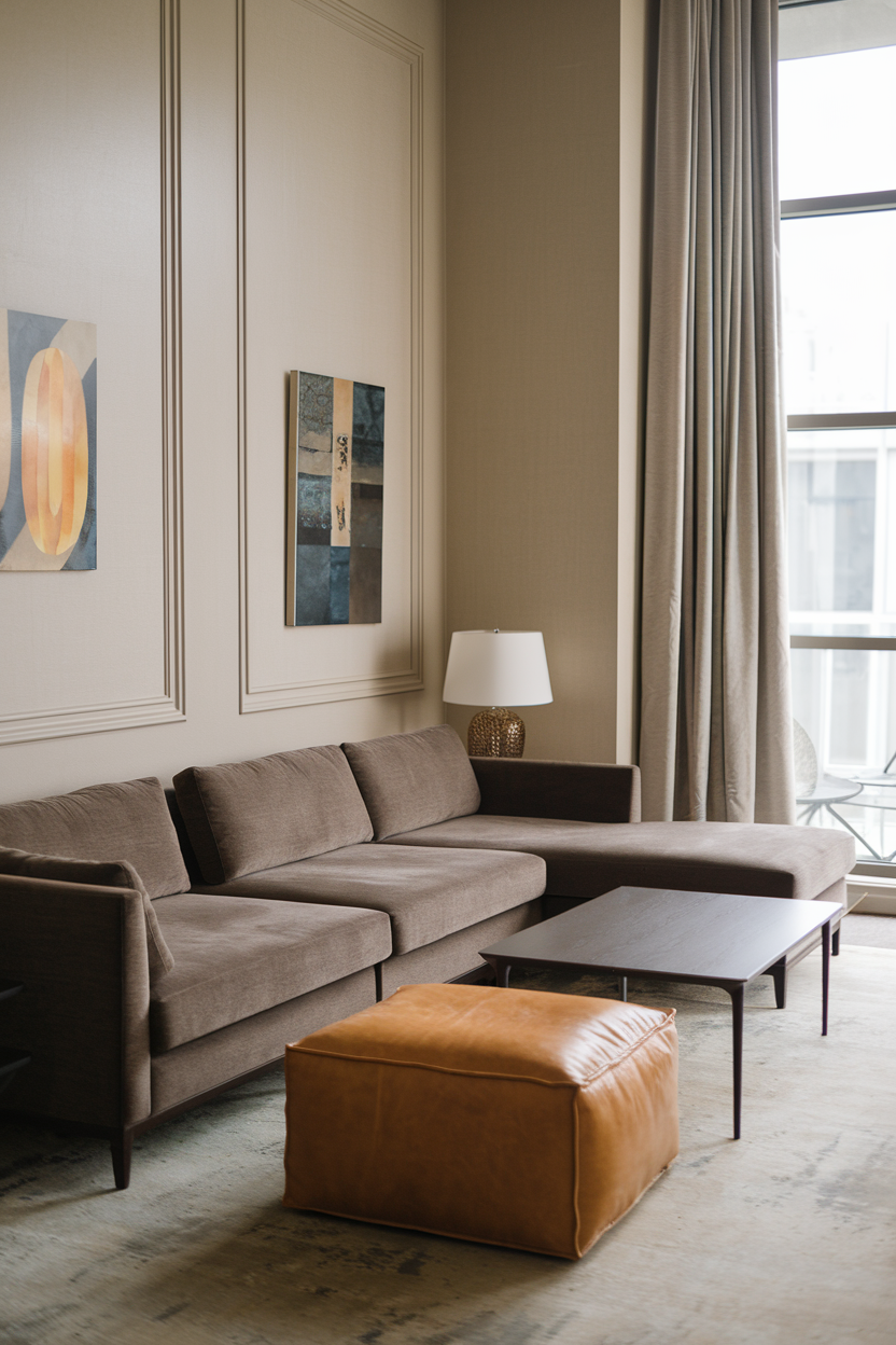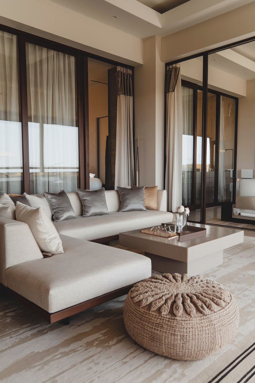 A suede pouf brings a soft, sophisticated touch to your living room. The smooth texture of suede combined with its luxurious appearance creates an elegant, high-end feel, making it a perfect complement to more refined or modern decor. Suede poufs often come in earthy tones like camel, taupe, or muted burgundy, allowing them to blend seamlessly into various color schemes. Its plush texture makes it a comfortable choice for use as a footrest or extra seating, while its sleek design ensures that it enhances the room’s overall aesthetic.