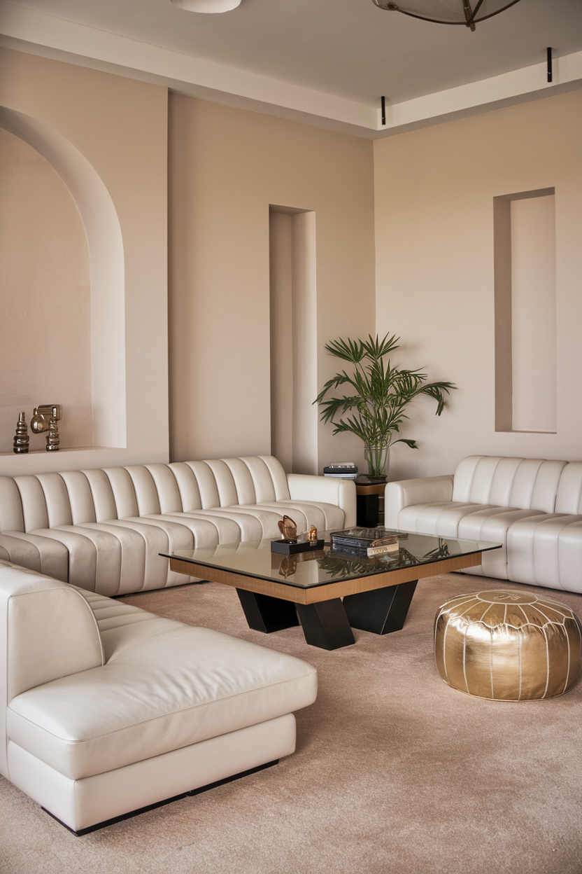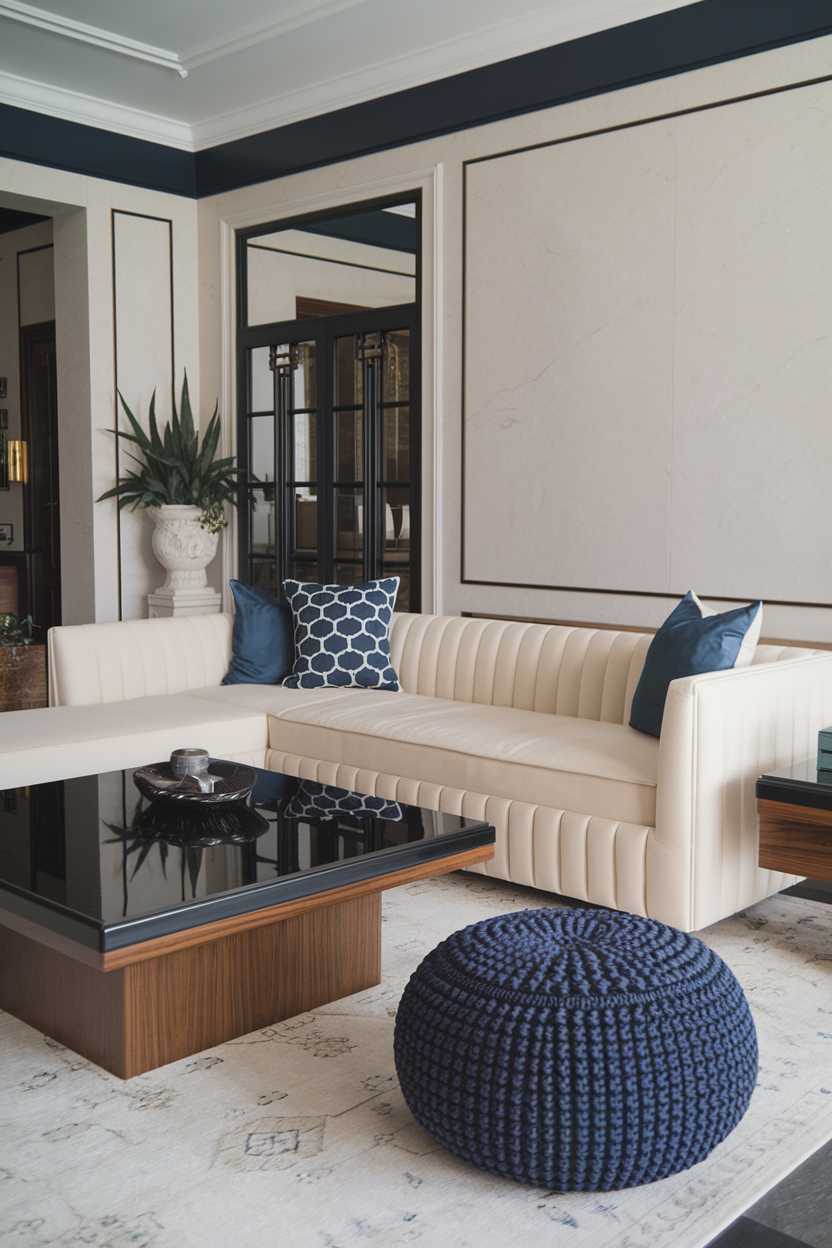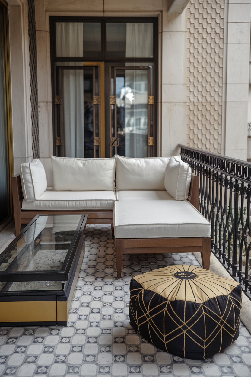 An art deco pouf captures the essence of the glamorous and luxurious design style from the early 20th century. Featuring bold geometric patterns, metallic accents, and elegant textures like velvet or satin, this pouf adds an upscale, vintage-inspired touch to your living room. Its sleek lines and striking design make it an eye-catching piece in any space, often complementing a color scheme of black, gold, and white. The art deco pouf can serve as a functional footrest or an accent piece in a living room with a sophisticated, luxurious vibe, bringing a timeless touch to your decor.