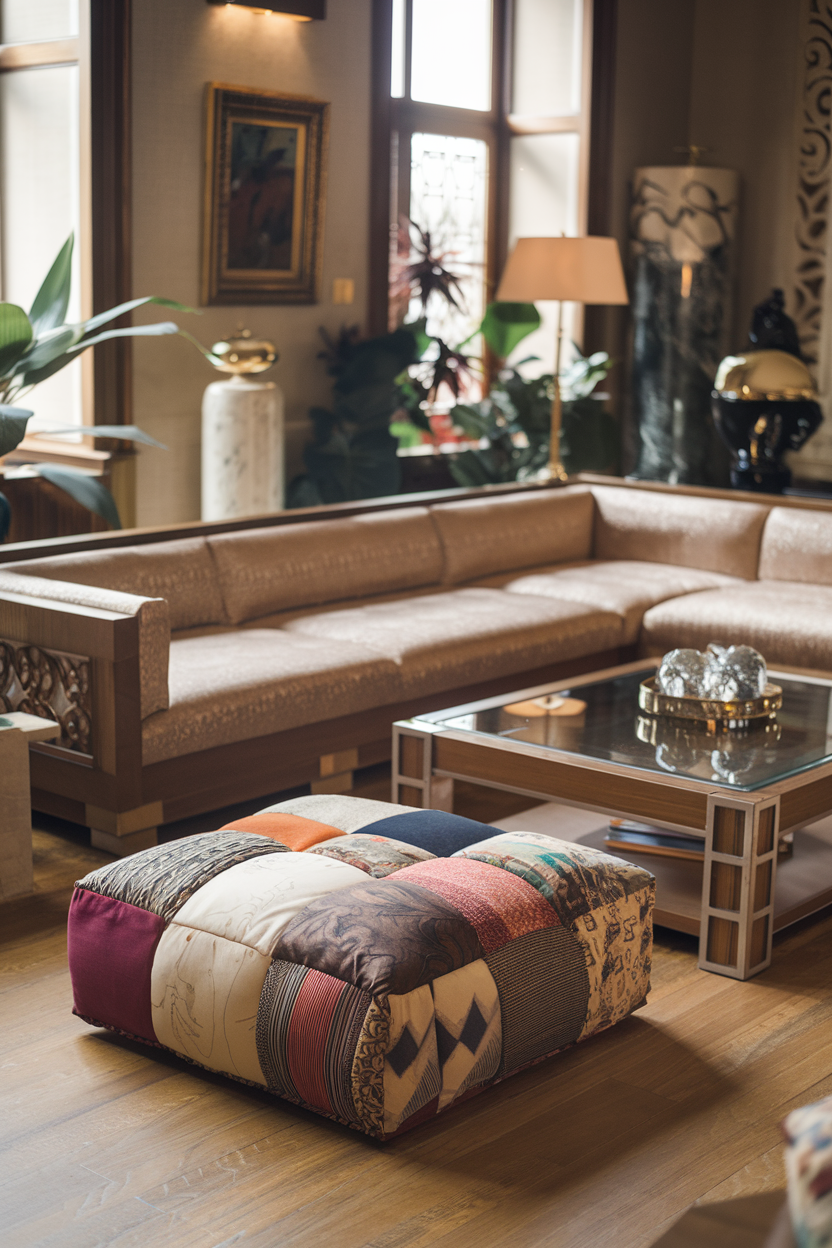 A patchwork pouf brings a sense of eclectic style and personal flair to your living room. Made from a collection of different fabrics, ranging from cotton to leather, this pouf creates a beautiful mosaic of colors and textures. Whether it’s vintage-inspired patterns or modern geometric prints, the patchwork design offers visual intrigue and warmth. This pouf works particularly well in bohemian, eclectic, or artistic living rooms, where diverse textures and patterns are encouraged. It’s also an excellent option for injecting a pop of color into neutral spaces, offering both style and utility.