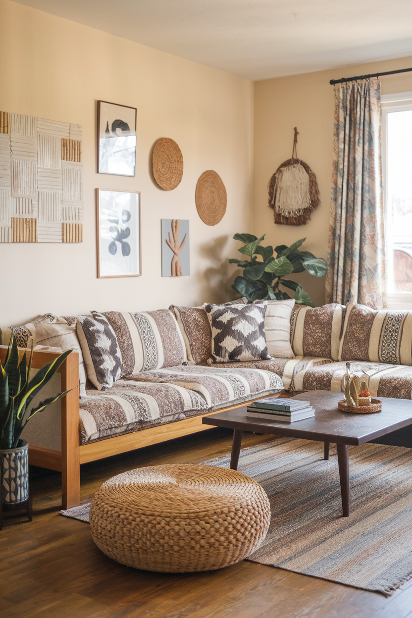 A boho woven pouf is the perfect way to infuse your living room with texture and personality. Typically made from natural fibers such as jute, seagrass, or cotton, these poufs often feature intricate woven patterns or macrame details, which add a handmade, organic feel to your space. The earthy tones and simple yet striking designs make them ideal for bohemian, coastal, or eclectic living rooms. Not only does this pouf serve as a functional seating option or footrest, but its visual appeal also brings a laid-back, relaxed vibe to the room.