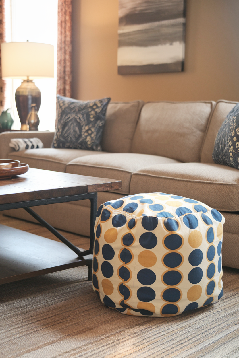 If you’re looking to introduce a playful element to your living room, a striped pouf is a fantastic choice. The bold lines of the stripes can be either subtle or bold, depending on your color palette. Striped poufs work particularly well in both modern and nautical-themed living rooms, as they bring energy and character without overwhelming the space. They are also incredibly versatile, easily pairing with other patterns and textures, whether on a rug or throw pillows. The visual contrast and movement they provide make them an ideal addition to a fun, dynamic living room.