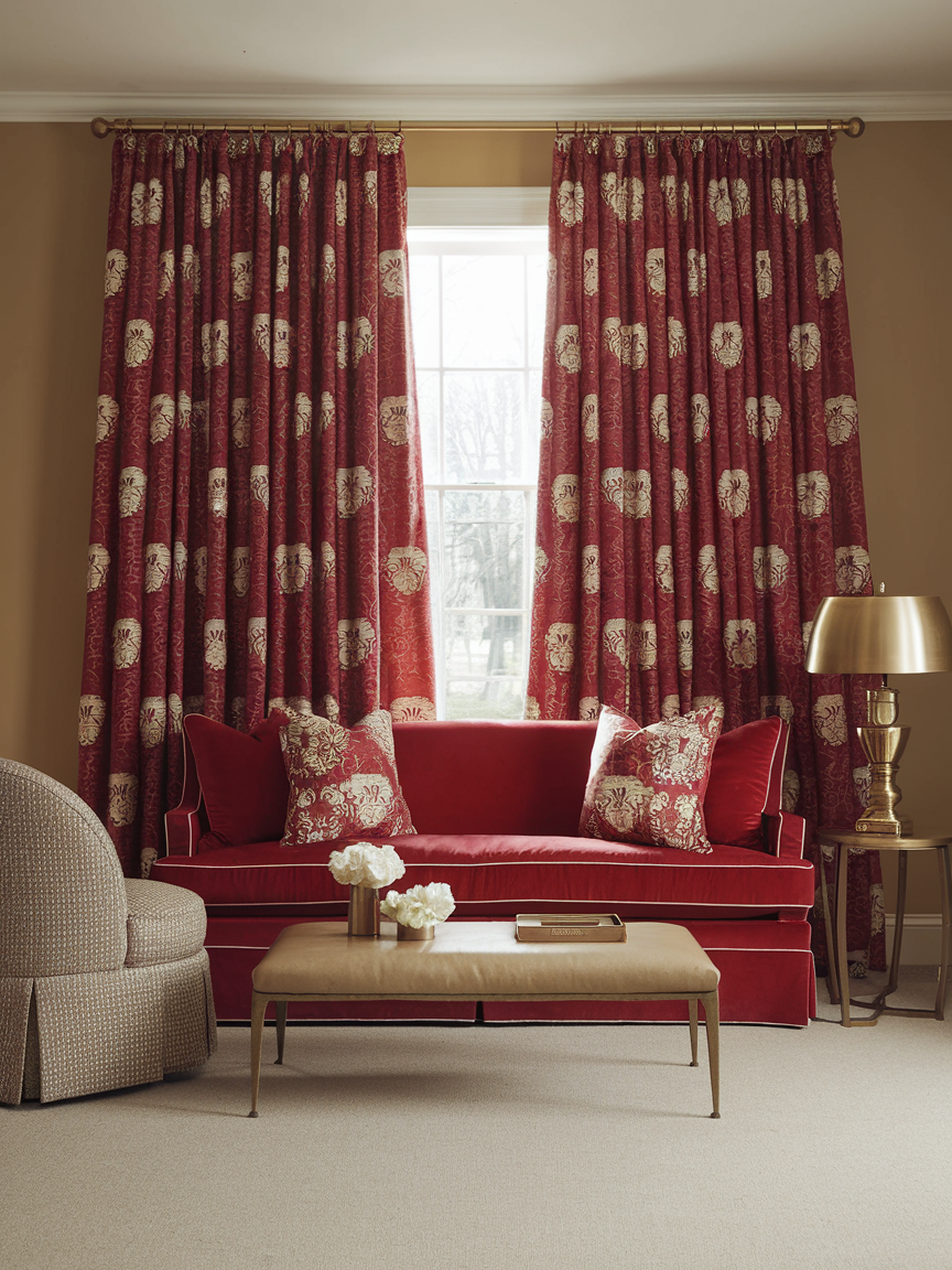 Red curtains introduce both color and softness, framing windows while adding vertical dimension to the living room. Depending on the fabric, they can create different moods—sheer materials allow light to filter through gently, while heavier drapes add richness and drama. Curtains also improve acoustics and contribute to a more comfortable atmosphere. When paired with neutral walls and furnishings, red curtains feel sophisticated and balanced, enhancing the room’s overall design.