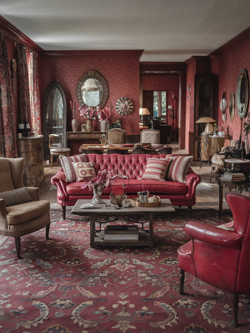 Vintage-inspired red living rooms celebrate character, history, and layered storytelling through design. Rich shades like oxblood, brick red, and deep crimson feel authentic and timeless, especially when paired with antique wood furniture, ornate mirrors, and classic patterned textiles. Red naturally complements vintage elements such as Persian-style rugs, aged leather seating, and brass accents, creating a space that feels collected rather than styled. The key to success lies in layering—combining textures, finishes, and décor pieces that feel curated over time. This approach results in a living room that feels warm, soulful, and deeply personal, where bold color enhances nostalgia rather than overwhelming it.