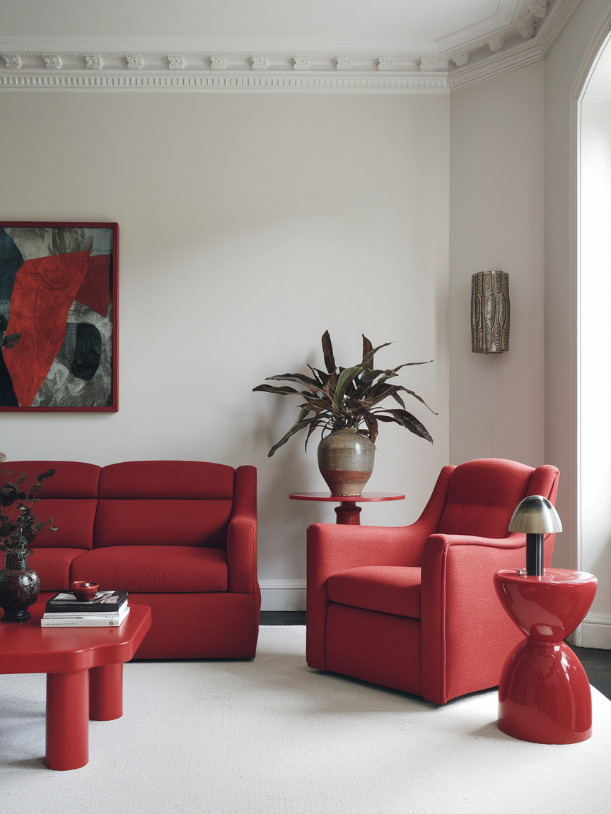 Red feature furniture offers a flexible way to incorporate bold color without committing to a dominant focal point. Pieces like armchairs, ottomans, benches, or side tables in red can instantly energize a space while maintaining design versatility. These elements add movement and visual rhythm, drawing the eye without overwhelming the room. Because they are smaller in scale, they can be easily repositioned or replaced, making them ideal for evolving interiors. Red feature furniture allows you to experiment with color in a playful yet controlled way, creating a dynamic and personalized living room.