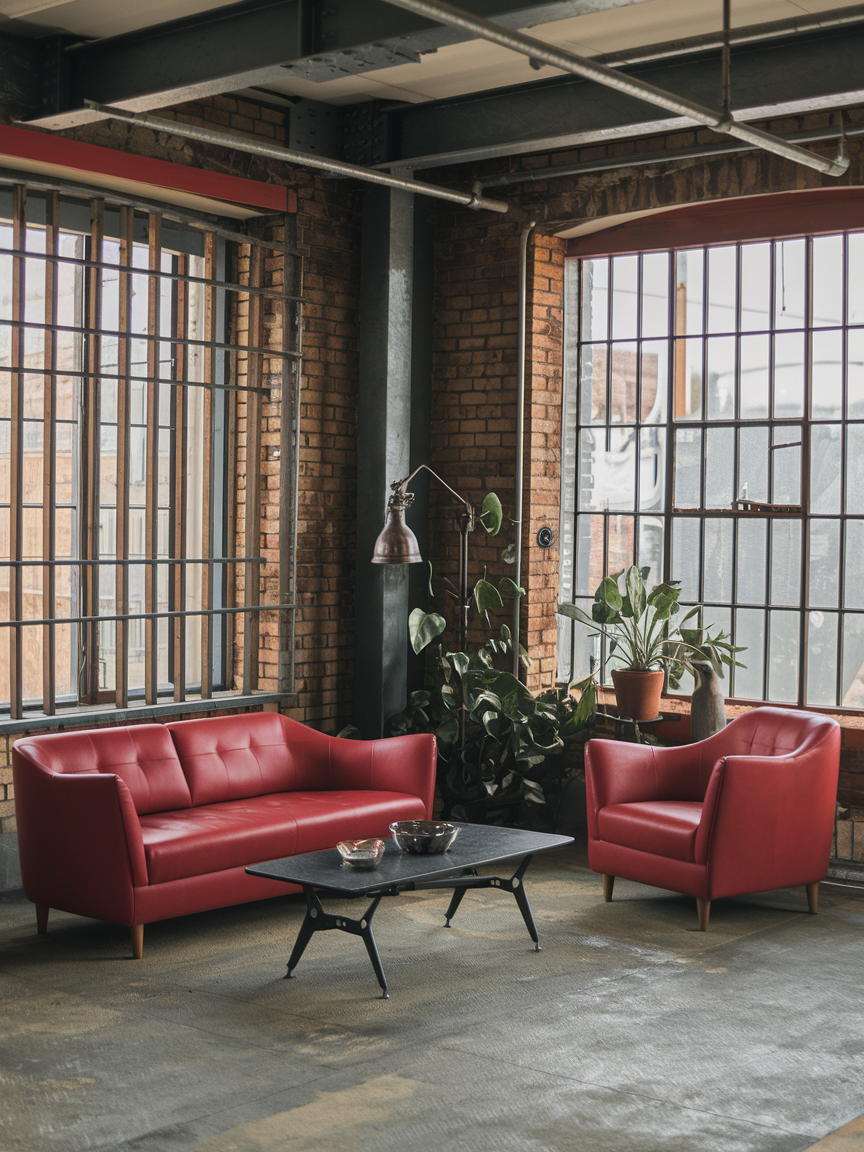 In industrial-style living rooms, red introduces warmth and contrast against raw materials like concrete, metal, and exposed brick. Without color, these spaces can feel stark, but red softens the look while maintaining its edgy appeal. Red sofas, artwork, or accent walls stand out beautifully against neutral industrial backdrops. Black metal frames, steel lighting, and minimalist furniture enhance the urban aesthetic. This combination creates a living room that feels bold, modern, and architecturally interesting.