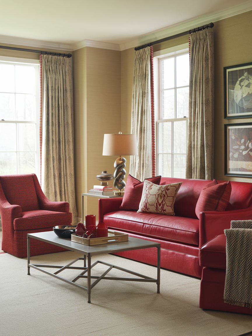 Pairing red with neutral tones is a timeless approach that creates a harmonious and sophisticated living room. Colors like white, beige, gray, and taupe provide a calming backdrop that softens red’s intensity while allowing it to stand out as a focal point. This balance ensures the space feels inviting rather than overwhelming, making it suitable for both modern and traditional interiors. Neutral elements also enhance the versatility of the design, allowing you to adjust accents and accessories over time. The combination results in a space that feels polished, elegant, and comfortable, offering the perfect blend of boldness and restraint.