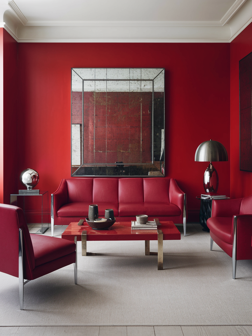 Metallic finishes add polish and refinement to red living rooms, creating a balanced contrast between warmth and shine. Materials like brass, gold, chrome, or steel reflect light and enhance the richness of red tones. Metallic accents can appear in lighting, furniture details, mirrors, or decorative objects, adding depth and dimension. This combination feels modern and luxurious, resulting in a space that is both bold and elegantly styled.