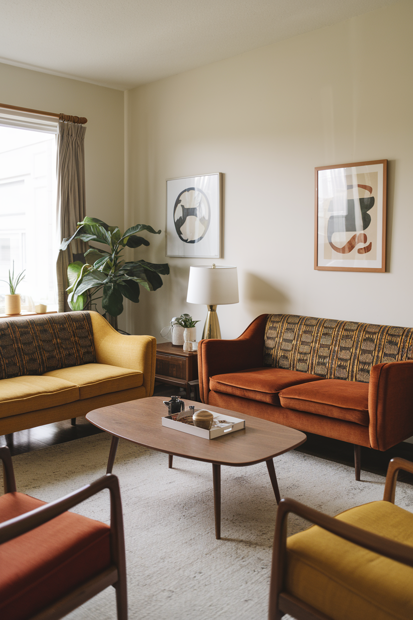 Retro sofas add a pop of color and nostalgia to your living room. With their bold patterns, curved arms, and mid-century modern influence, retro sofas are perfect for creating a fun, vintage-inspired space. These pieces often come in bright, saturated colors like mustard yellow, teal, or burnt orange, adding a cheerful vibe to any room. By incorporating a retro sofa, you can instantly transport your living room back to the mid-20th century, giving it a playful and energetic feel.