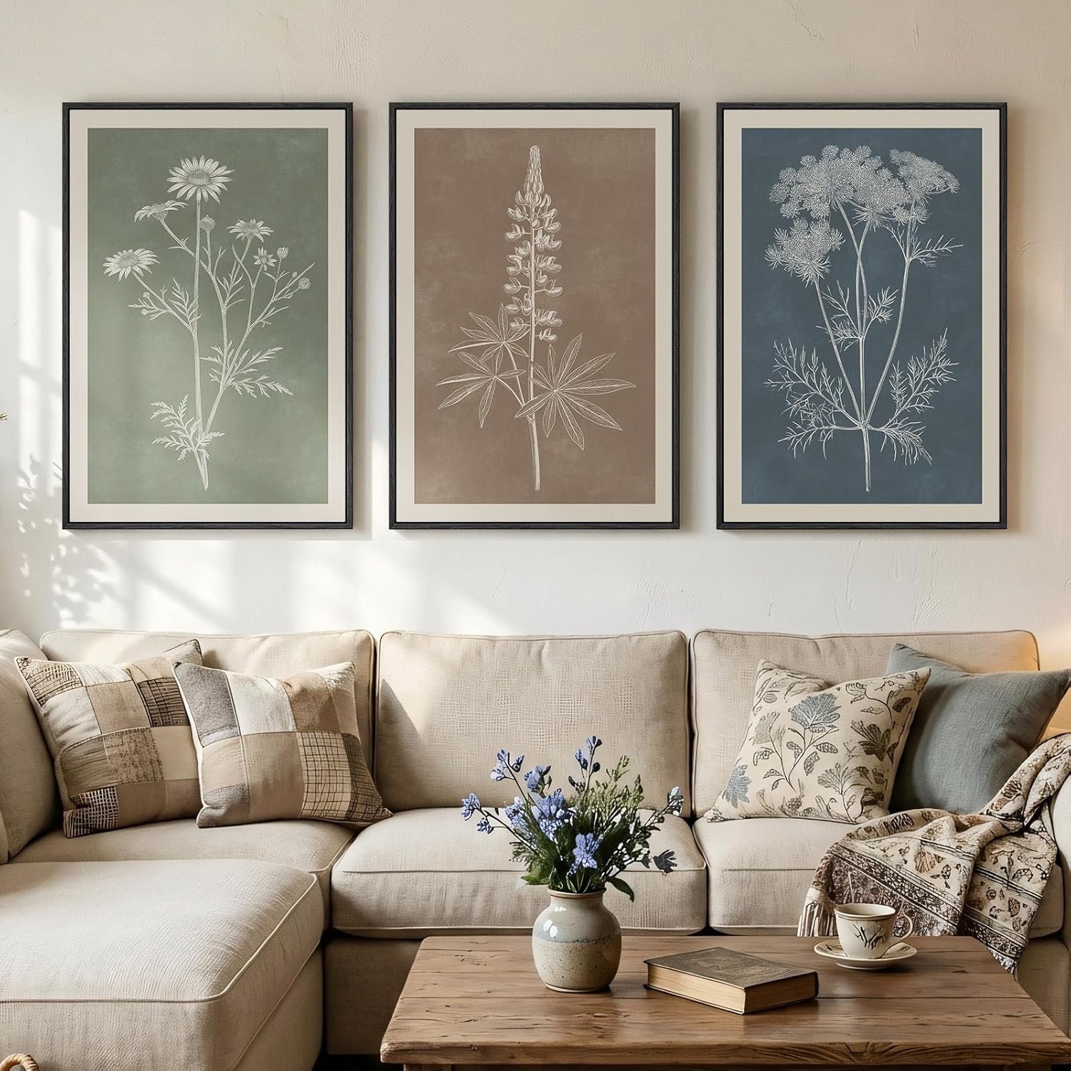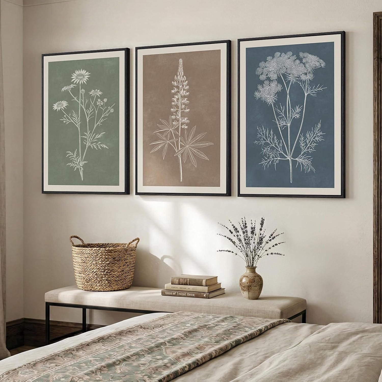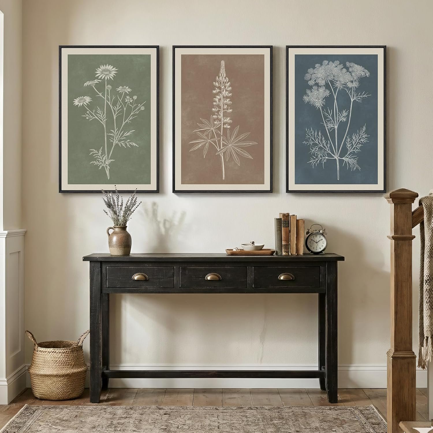 Bring understated elegance to your home with this wood-framed boho botanical wall art set, designed to blend timeless beauty with modern simplicity. The set includes three large vertical prints, each measuring 24 x 36 inches, framed in solid black wood for a refined, minimalist look. Inspired by antique botanical illustrations, the neutral color palette pairs effortlessly with rustic farmhouse and boho farmhouse interiors, adding warmth without overpowering your décor.