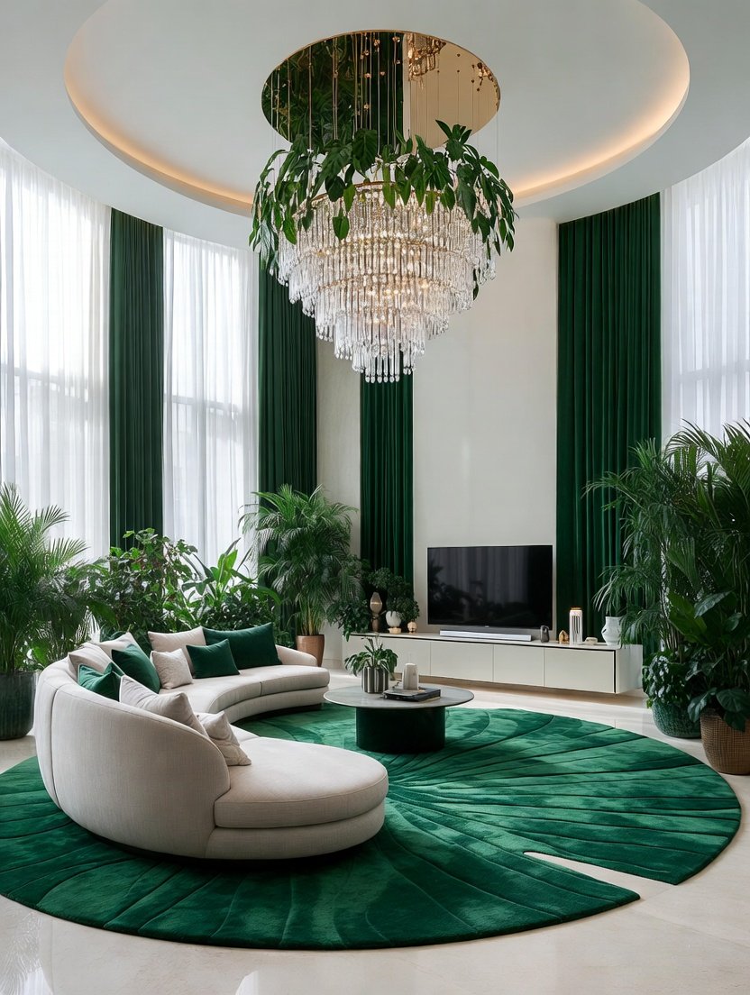 This living room blends modern sophistication with the calming beauty of nature. A large curved beige sectional creates a soft, welcoming focal point, while a vibrant emerald green rug with a subtle leaf motif introduces freshness and visual energy. Floor-to-ceiling windows dressed in sheer white and deep green curtains allow natural light to flow freely, enhancing the airy atmosphere. A statement crystal chandelier adorned with delicate leaf details adds glamour while reinforcing the organic theme. Abundant potted plants placed strategically around the room bring life and texture, creating a serene indoor oasis. A sleek white media wall keeps the design clean and contemporary, allowing the color palette of green, white, and warm neutrals to feel cohesive, elegant, and effortlessly luxurious.