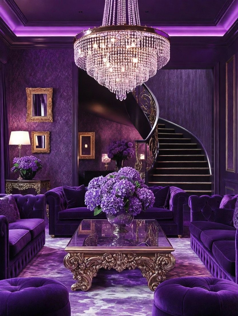 For those who love dramatic elegance, a royal purple and gold palette delivers undeniable luxury. Plush tufted velvet sofas and ottomans in deep purple create a rich, comfortable seating arrangement centered around a striking coffee table with a clear glass top and intricately carved gold base. A lush arrangement of purple hydrangeas adds softness and refinement to the centerpiece. Above, a multi-tiered crystal chandelier casts a warm glow that enhances the regal atmosphere. Textured purple wallpaper, gold-framed mirrors, and metallic accents amplify the opulent feel. In the background, a graceful spiral staircase adds architectural drama, turning the space into a grand statement area. A patterned rug in soft lavender and grey tones balances the bold palette, creating a living room that feels both luxurious and inviting.