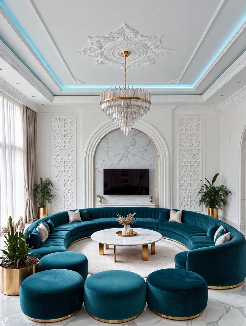 This super-luxury living room combines bold color with refined materials. A plush curved sectional in rich teal forms a semi-circle that encourages conversation and comfort. At the center, a round white marble coffee table adds timeless sophistication, complemented by matching teal ottomans. The ceiling features intricate white molding enhanced by soft blue accent lighting and an elegant crystal chandelier that anchors the space. White wall paneling with geometric cut-out details introduces depth and architectural interest, while a marble-textured arched feature wall highlights the TV area beautifully. Tall windows with sheer curtains keep the space bright and airy, and gold planters filled with greenery add warmth and contrast. The white marble flooring, paired with a subtle area rug, completes the look with a polished, high-end finish.