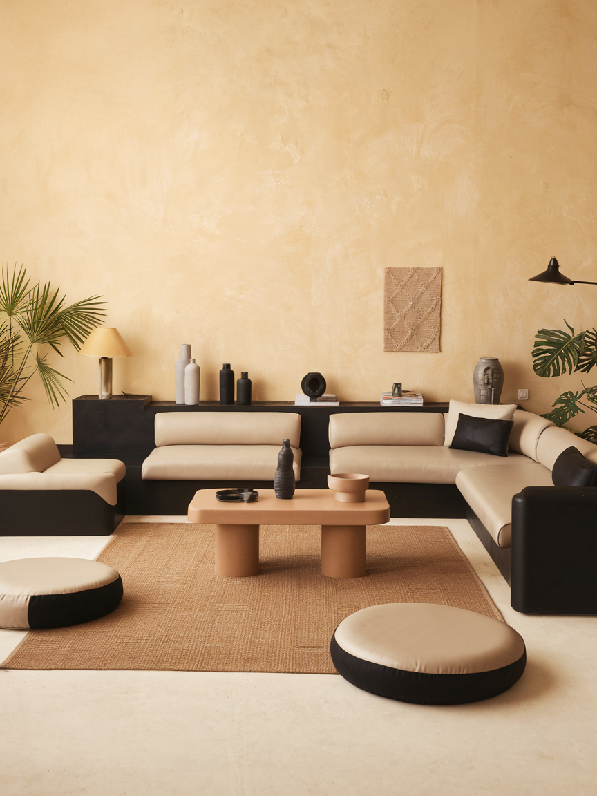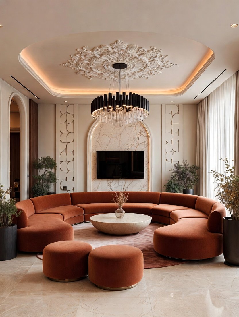Earthy tones bring warmth and depth to luxury interiors, and this terracotta-themed living room achieves both effortlessly. A curved sectional in rich terracotta fabric creates a cozy yet refined seating area, paired with matching round ottomans for added comfort and flexibility. A cream marble coffee table lightens the palette while maintaining an upscale feel. The ceiling’s decorative cream molding is enhanced by warm amber lighting, creating a soft, inviting glow throughout the space. A black metal and crystal chandelier introduces contrast and modern sophistication. Cream wall paneling with geometric detailing and a marble-textured feature niche elevates the media wall, while sheer cream curtains soften the tall windows. Matte black planters and light beige marble flooring complete the design, resulting in a balanced space that feels warm, contemporary, and quietly luxurious.