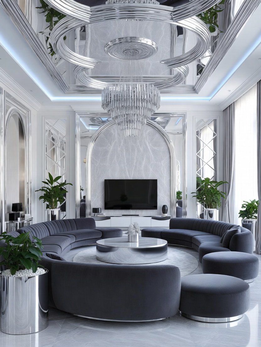 For a sleek and modern luxury aesthetic, a palette of charcoal grey and silver-white creates a calm yet striking environment. A plush curved sectional in deep grey anchors the room, paired with matching ottomans and a round silver-white marble coffee table. Intricate ceiling molding illuminated by cool blue accent lighting enhances the contemporary atmosphere, while a chrome and crystal chandelier adds a glamorous focal point. Silver-white wall paneling with geometric cut-outs and a marble-textured feature wall behind the TV adds depth and texture without overwhelming the design. Sheer curtains filter natural light beautifully, keeping the space bright and airy. Chrome planters introduce subtle shine, and light grey marble flooring with a soft patterned rug completes the polished, sophisticated look.