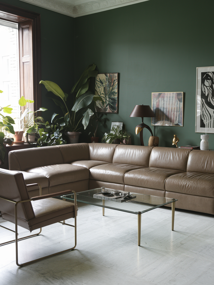 Olive green adds richness and quiet sophistication to a living room. Its deep, earthy tone feels grounded while still offering depth and visual interest. This color complements leather sofas, natural wood finishes, and warm metallics such as brass or copper. Olive green works beautifully in both modern and traditional interiors, making it incredibly versatile. The shade creates a cozy, enveloping atmosphere without feeling too dark or heavy. When paired with layered textures and warm lighting, it results in a living room that feels intimate, elegant, and thoughtfully designed.