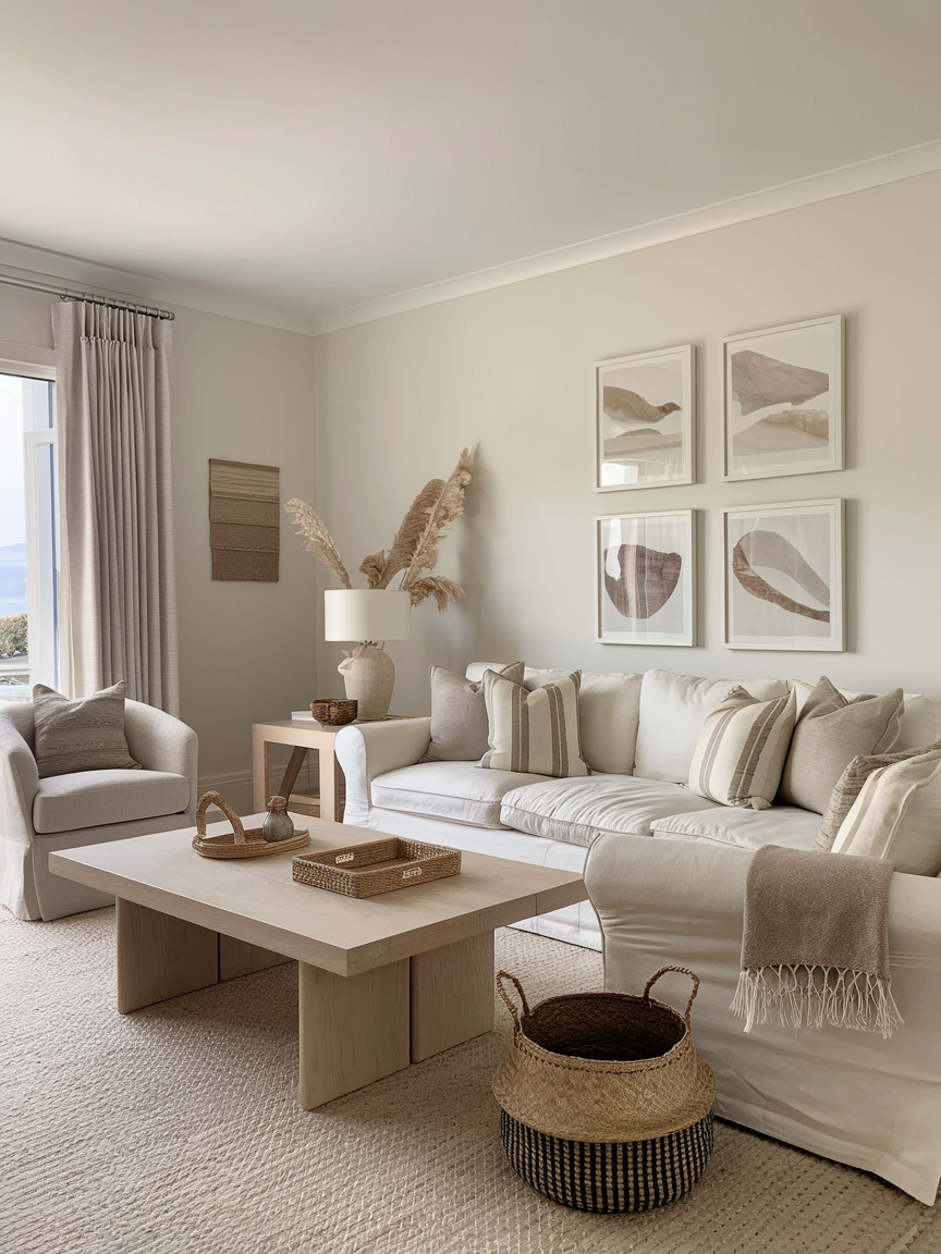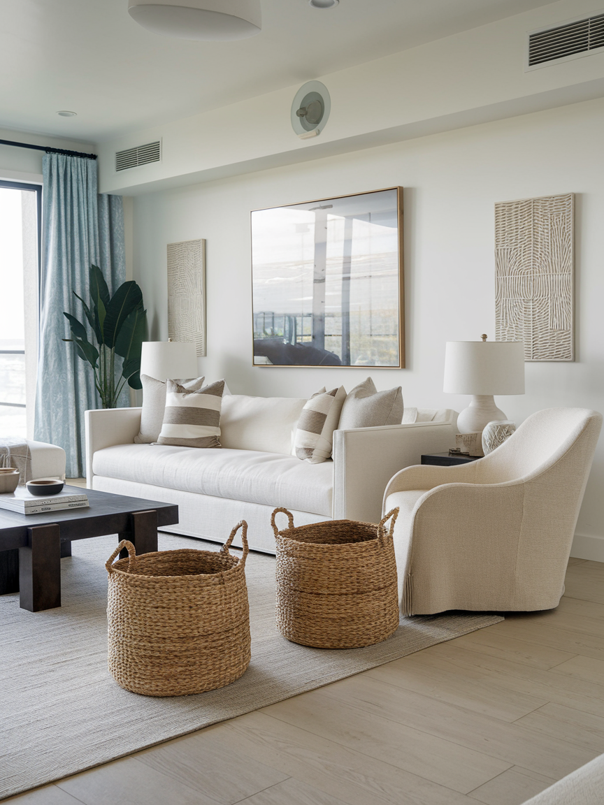 Woven baskets combine practicality with aesthetic appeal. Use them to store blankets, magazines, or extra pillows while keeping the space organized. Natural materials like seagrass or rattan complement the coastal theme effortlessly. Position baskets beside sofas or under console tables for easy access. Their texture adds depth and warmth, reinforcing the organic layers within the room.