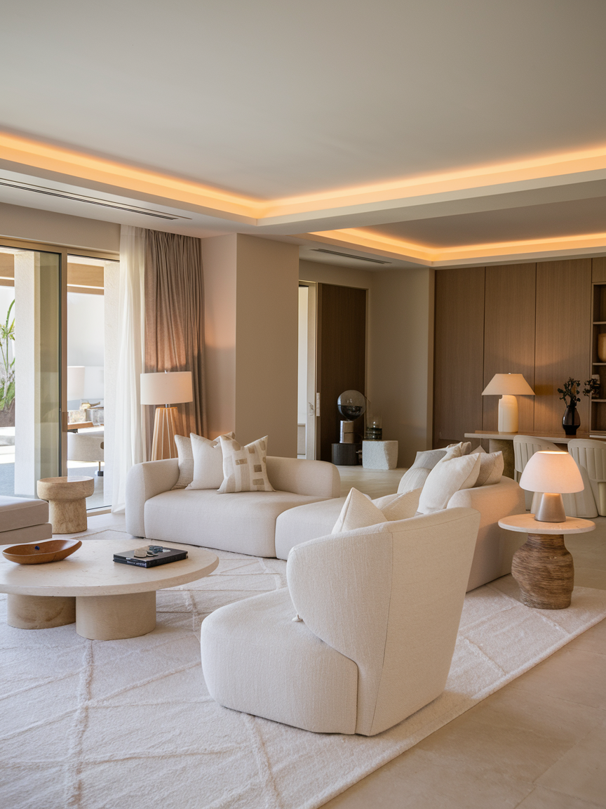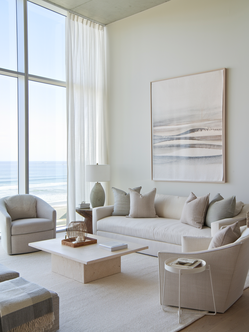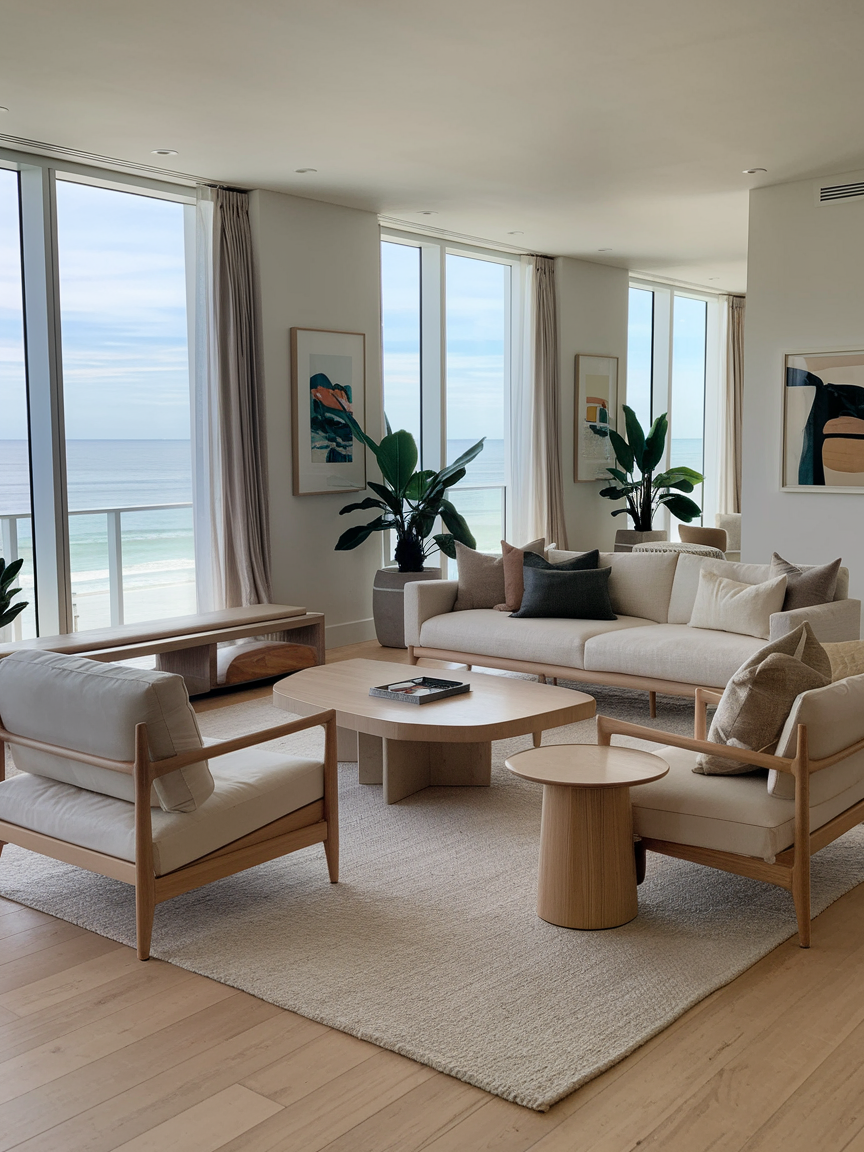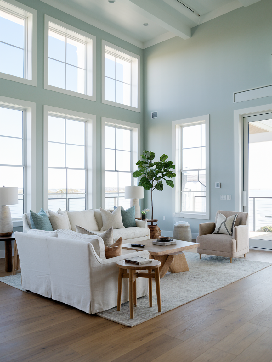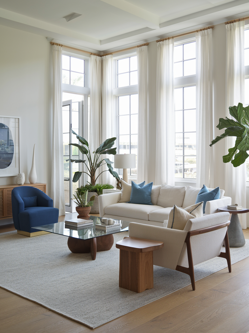 A well-designed modern coastal living room balances comfort and simplicity. Linen sofas, woven accents, light wood finishes, and subtle nautical touches add character without overwhelming the space. Large windows, sheer curtains, and thoughtfully placed lighting enhance the breezy atmosphere, allowing the room to feel sunlit and welcoming throughout the day.