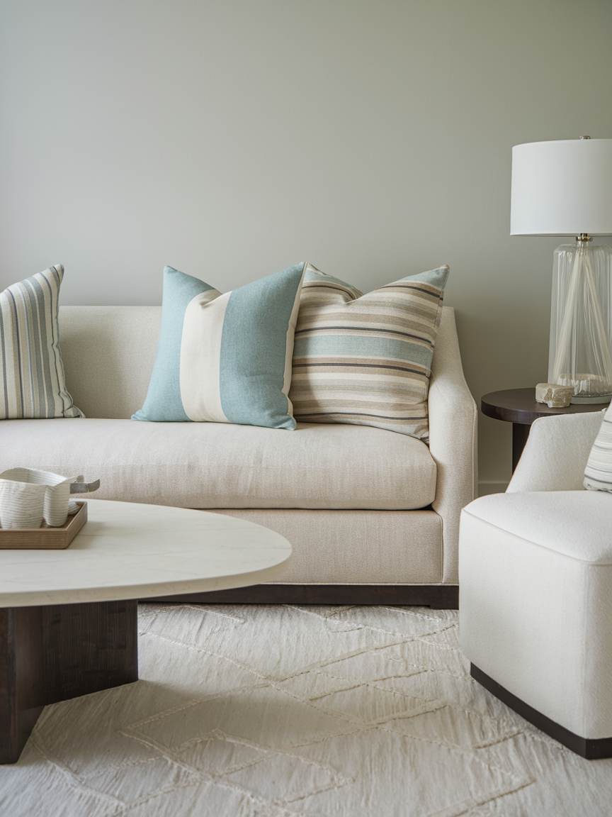Throw pillows are one of the easiest ways to introduce coastal character while keeping the living room modern and refined. Instead of bold nautical prints, choose pillows in soft linen, cotton, or woven fabrics featuring subtle stripes, gentle patterns, or muted textures. Shades like dusty blue, seafoam, warm beige, and soft gray blend beautifully with a neutral sofa. Layer different sizes to create depth, but keep the arrangement intentional and uncluttered. Mixing textures such as embroidery, fringe edges, or light knit details adds dimension without overpowering the clean aesthetic. Pillows should enhance comfort while maintaining visual harmony. This thoughtful layering creates a relaxed yet polished seating area that reflects the breezy elegance of modern coastal design without feeling overly themed.