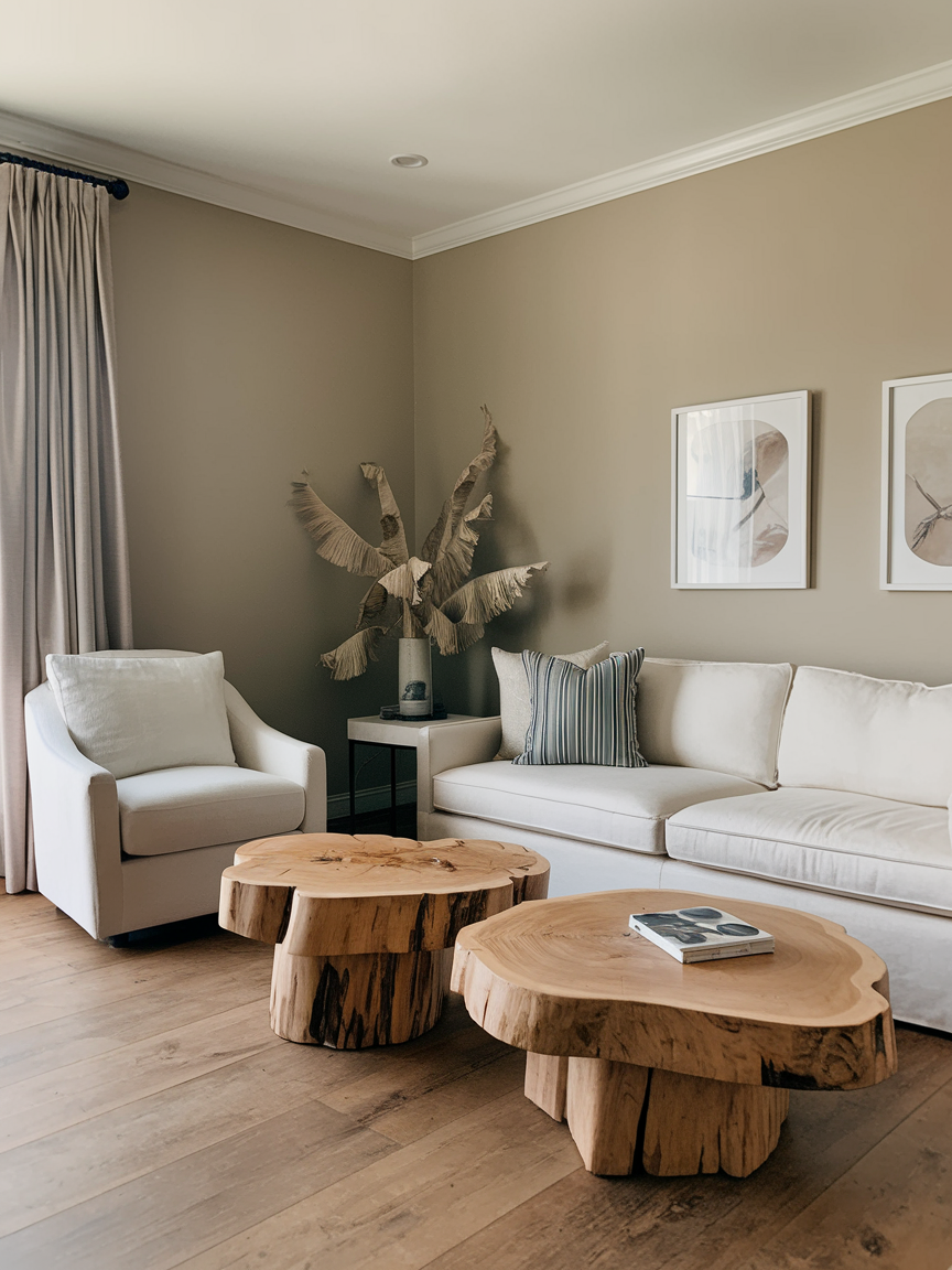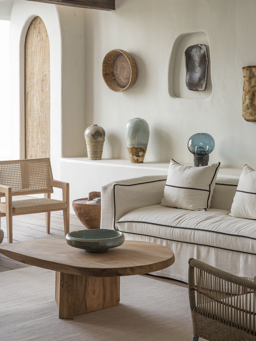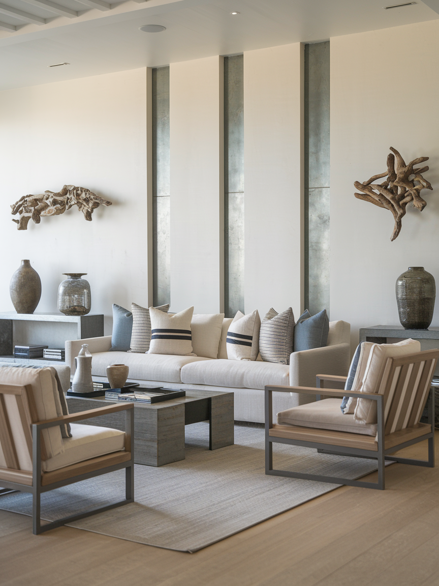 Driftwood-inspired décor brings natural authenticity into a modern coastal living room. Look for sculptural driftwood pieces, weathered wood bowls, or artistic wall accents that highlight organic shapes and textures. These elements add character while maintaining a neutral color palette. The irregular lines of driftwood contrast beautifully with clean-lined furniture, creating visual balance. Keep arrangements simple to avoid clutter—one statement piece on a console table or coffee table is often enough. Pair driftwood accents with ceramics or glass objects for subtle contrast. This combination reinforces the relaxed seaside aesthetic while preserving contemporary sophistication. The natural weathered finish reflects the beauty of the coast in a refined and understated way.
