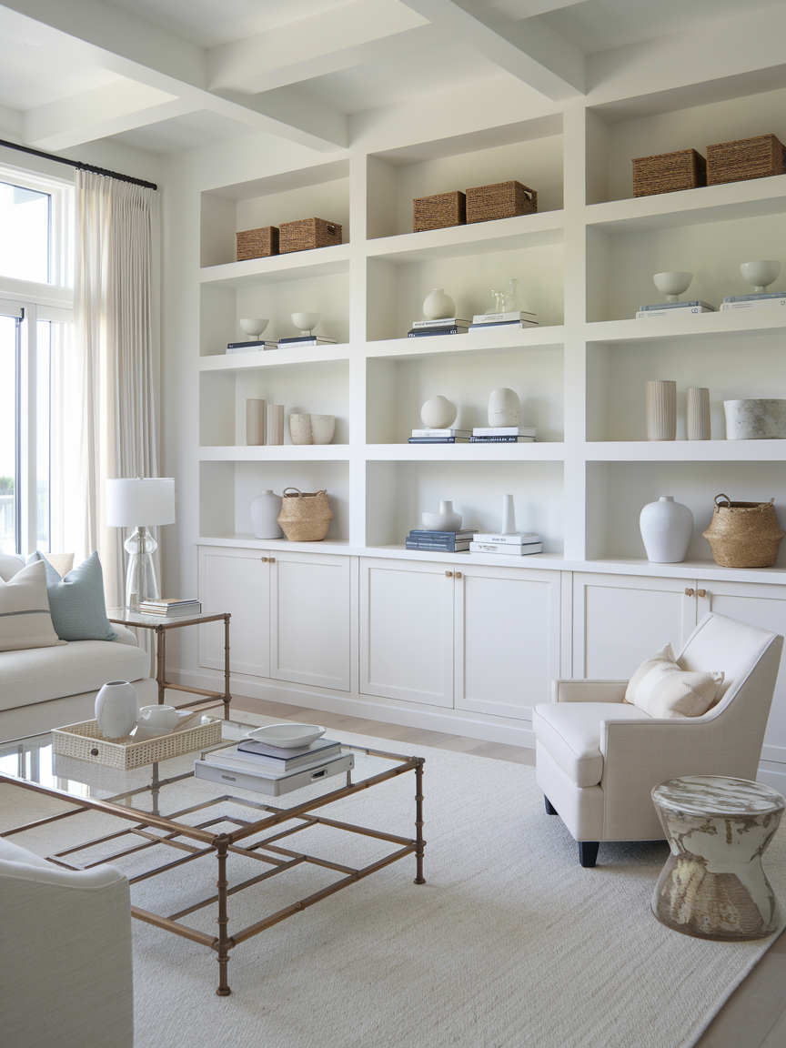 Built-in shelving painted crisp white enhances brightness while providing functional storage. Style shelves with restraint by incorporating neutral books, ceramic pieces, woven baskets, and subtle coastal-inspired décor. Leave negative space between items to maintain a clean and modern appearance. The key is thoughtful curation rather than overcrowding. Built-ins can frame a fireplace or television area beautifully, anchoring the room without overwhelming it. This architectural feature adds depth and structure while preserving the airy aesthetic essential to coastal interiors.