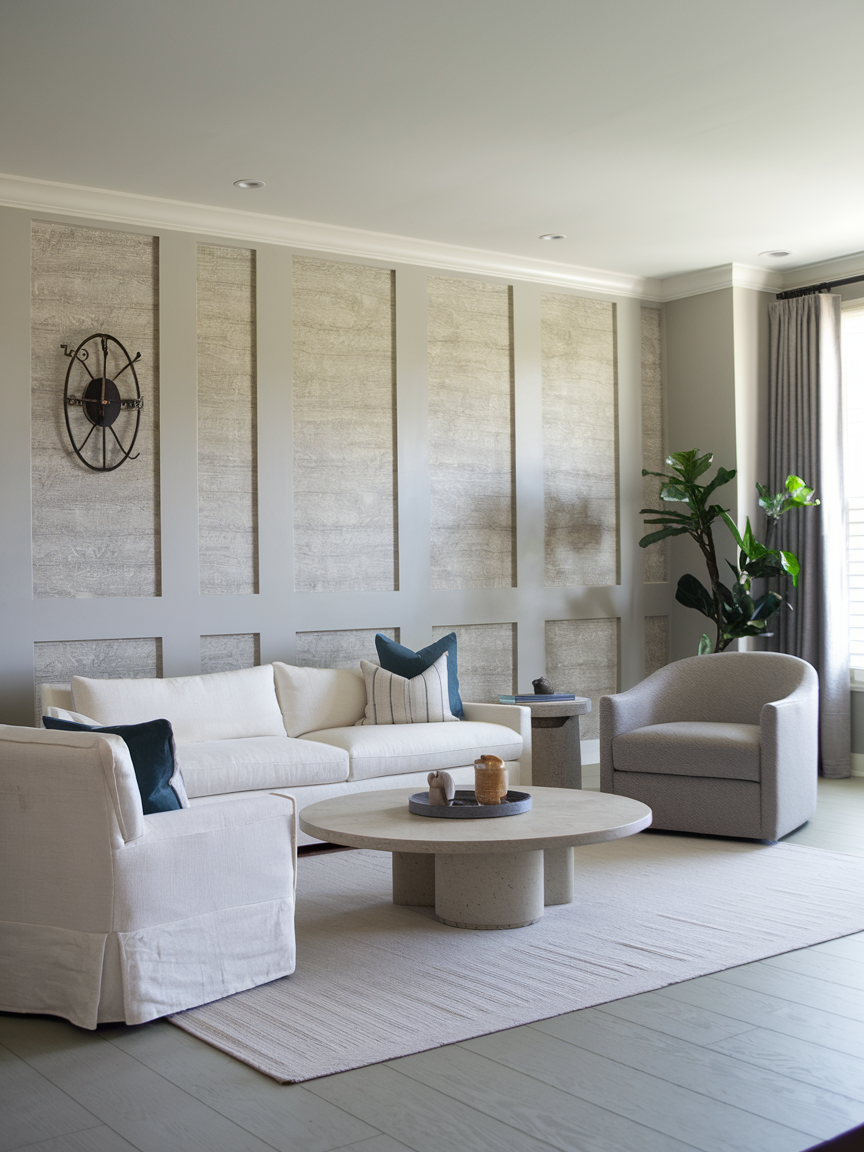 Textured wall treatments like shiplap or subtle paneling bring architectural interest to a modern coastal living room. Painted in soft white or light gray, these panels add dimension without introducing heavy contrast. The linear detail enhances the coastal vibe while maintaining a contemporary feel. Pair paneled walls with minimal décor to keep the look fresh and uncluttered. The added texture reflects light gently, contributing to the room’s airy atmosphere and polished appearance.