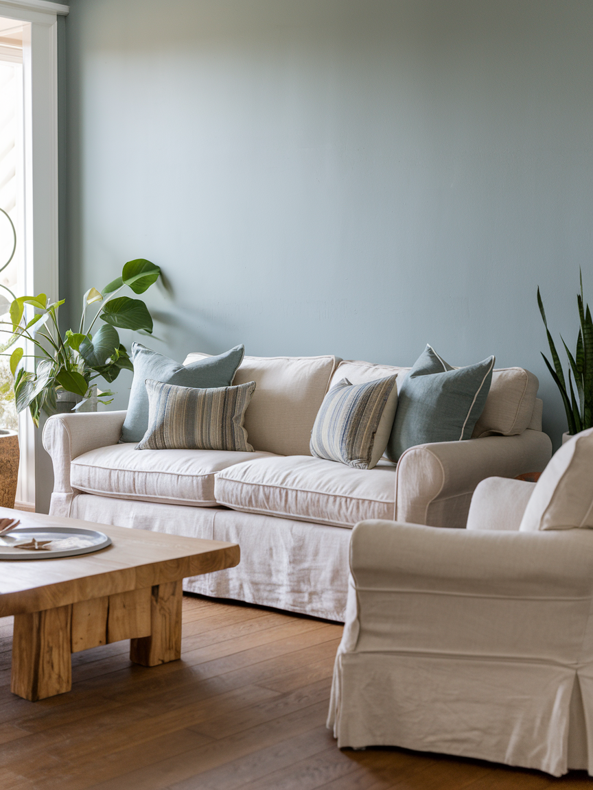 Linen slipcovered sofas are a hallmark of modern coastal interiors because they combine relaxed comfort with understated elegance. The slightly textured fabric adds softness while maintaining a clean silhouette. Choose neutral tones like ivory, cream, or warm white to keep the room bright and breathable. Slipcovers also add a practical element, making the living room feel casual and livable. Pair the sofa with textured throw pillows in muted blues or sandy shades for subtle contrast. The natural drape of linen enhances the effortless coastal mood, creating a space that feels both inviting and refined without appearing overly styled.
