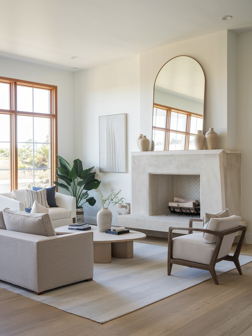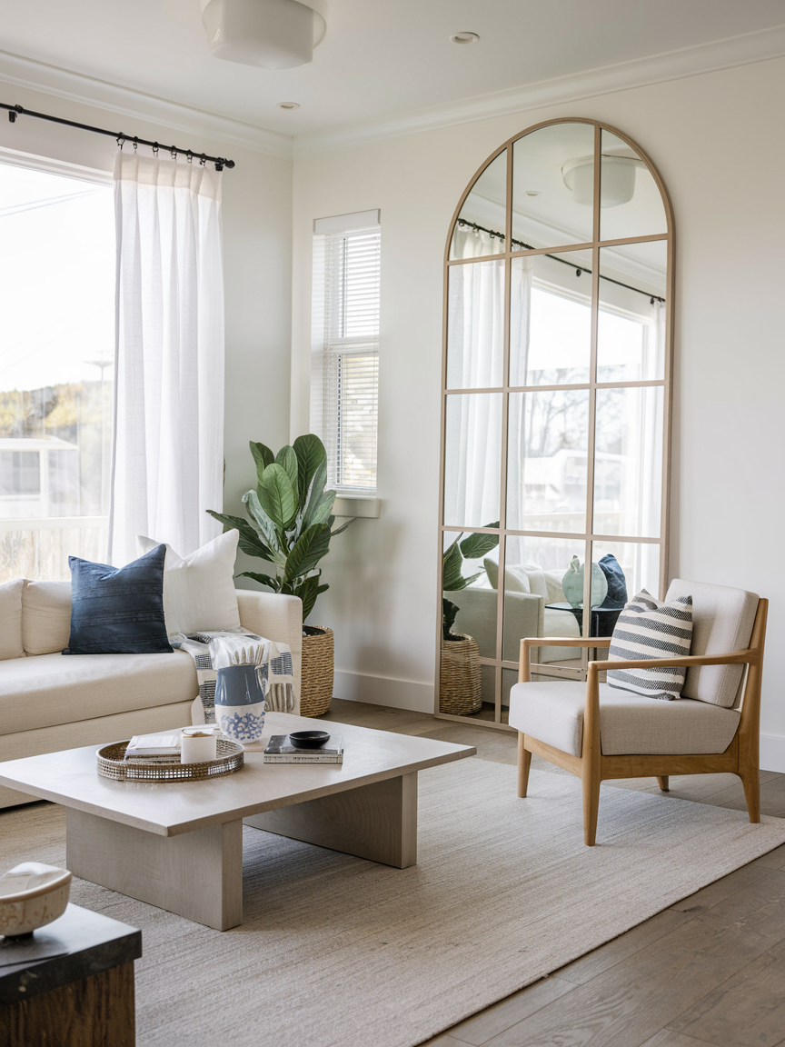 An oversized mirror is both functional and visually transformative in a modern coastal living room. Positioned opposite a window or near a light source, it reflects natural light and instantly makes the space feel larger and brighter. Choose a simple frame in light wood, matte black, or brushed metal to maintain contemporary appeal. Round or softly curved mirrors add a subtle organic touch, echoing the fluid shapes found in nature. Leaning a large mirror against the wall can create a relaxed yet stylish statement, while a mounted piece above a console table offers symmetry. Beyond aesthetics, mirrors enhance openness and amplify the breezy atmosphere that coastal interiors strive to achieve. This thoughtful addition strengthens the sense of space and light, contributing to an environment that feels airy, expansive, and inviting.