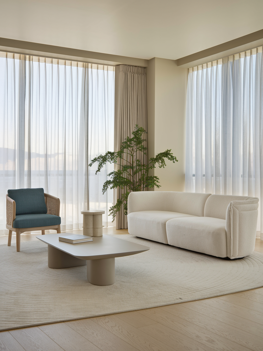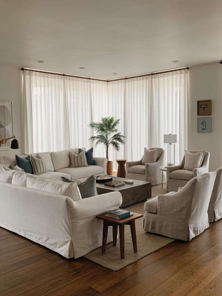 Natural light is essential in a modern coastal living room. If possible, highlight large windows and allow sunlight to flood the space. Dress windows with sheer white or cream curtains that gently filter light without blocking it. The soft movement of sheer fabric enhances the airy atmosphere while maintaining privacy. Avoid heavy drapes that can weigh down the design. Keeping window treatments light and minimal reinforces the breezy, open feeling that defines coastal style.