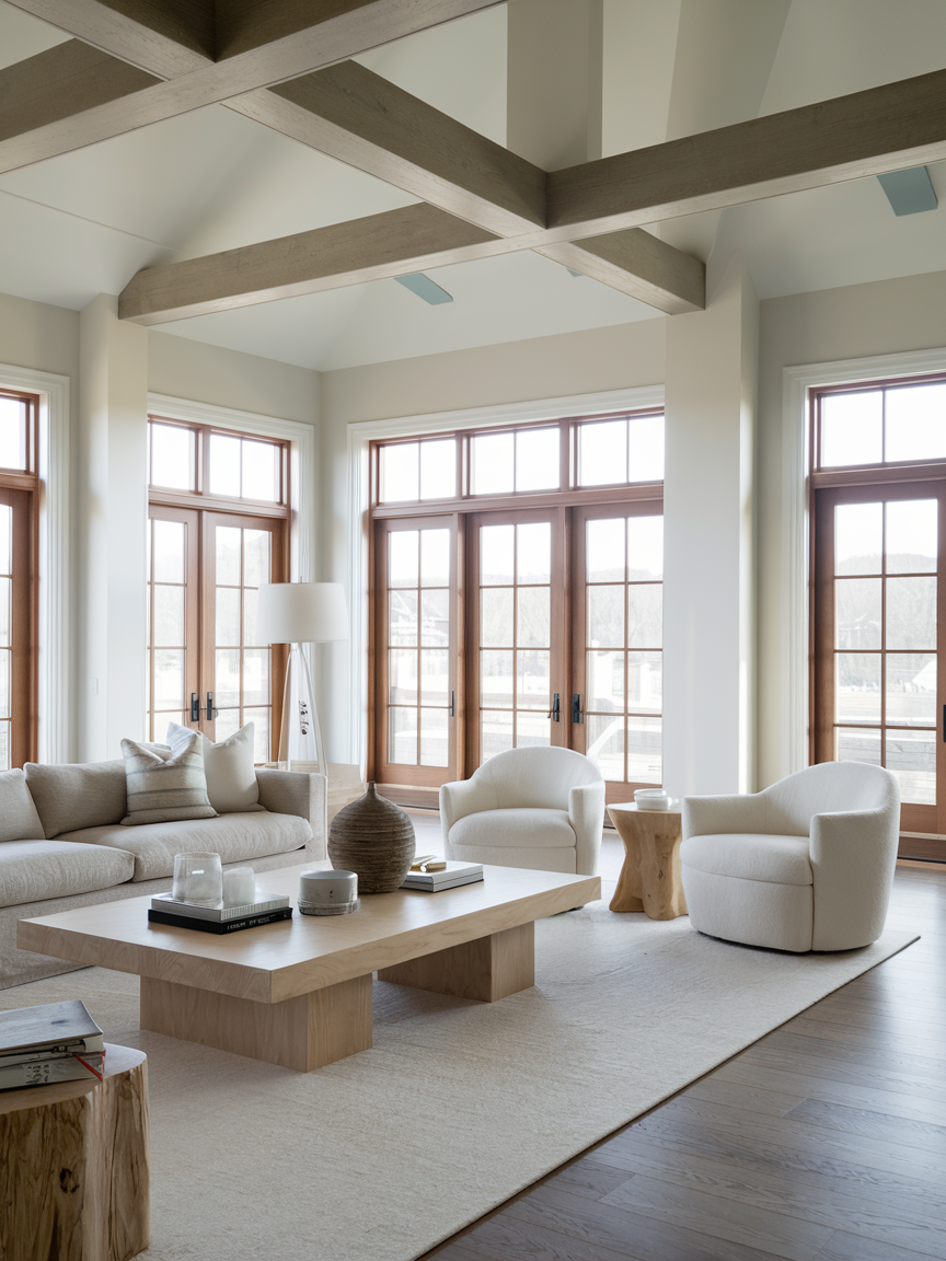 Light wood ceiling beams add architectural depth while preserving the airy nature of modern coastal design. Instead of dark, heavy finishes, choose pale oak or whitewashed wood to maintain brightness. Exposed beams draw the eye upward, emphasizing height and openness within the living room. When paired with white walls and large windows, beams create contrast that feels organic rather than rustic. The natural grain introduces warmth and subtle texture without overwhelming the clean lines of contemporary furniture. Keep the décor minimal below to allow the ceiling detail to stand out gracefully. This architectural element subtly references seaside cottages while maintaining a sophisticated and updated feel. The result is a balanced blend of charm and modern refinement.
