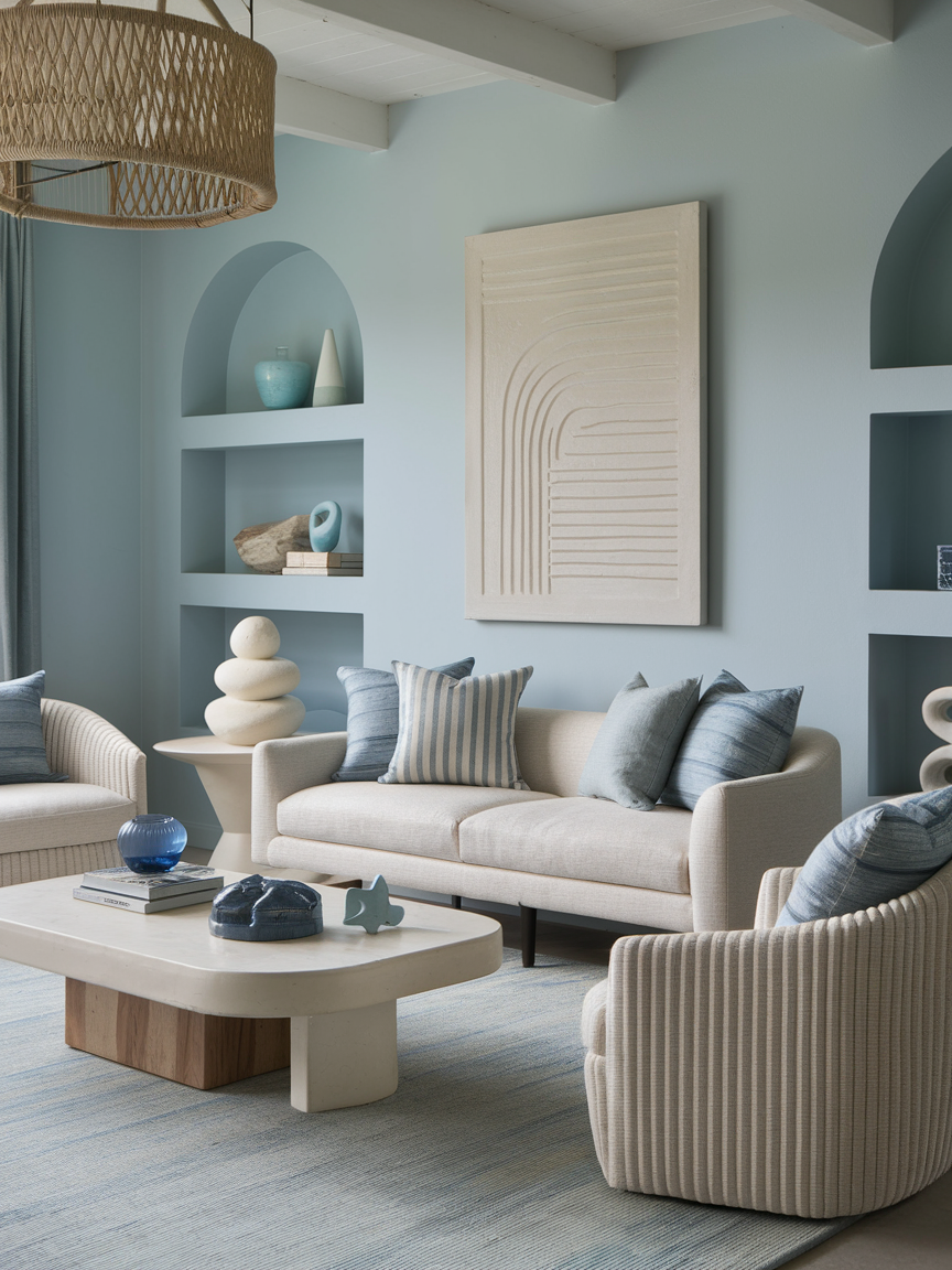 Introduce soft blue tones through throw pillows, artwork, or decorative objects to reflect the calming presence of the ocean. Choose muted shades like dusty blue, pale aqua, or soft navy rather than bold primary blues. These accents should feel gentle and balanced against a neutral base. Blue details add depth and interest while preserving the modern simplicity of the room. When layered thoughtfully, these tones create a cohesive, tranquil environment reminiscent of coastal waters.
