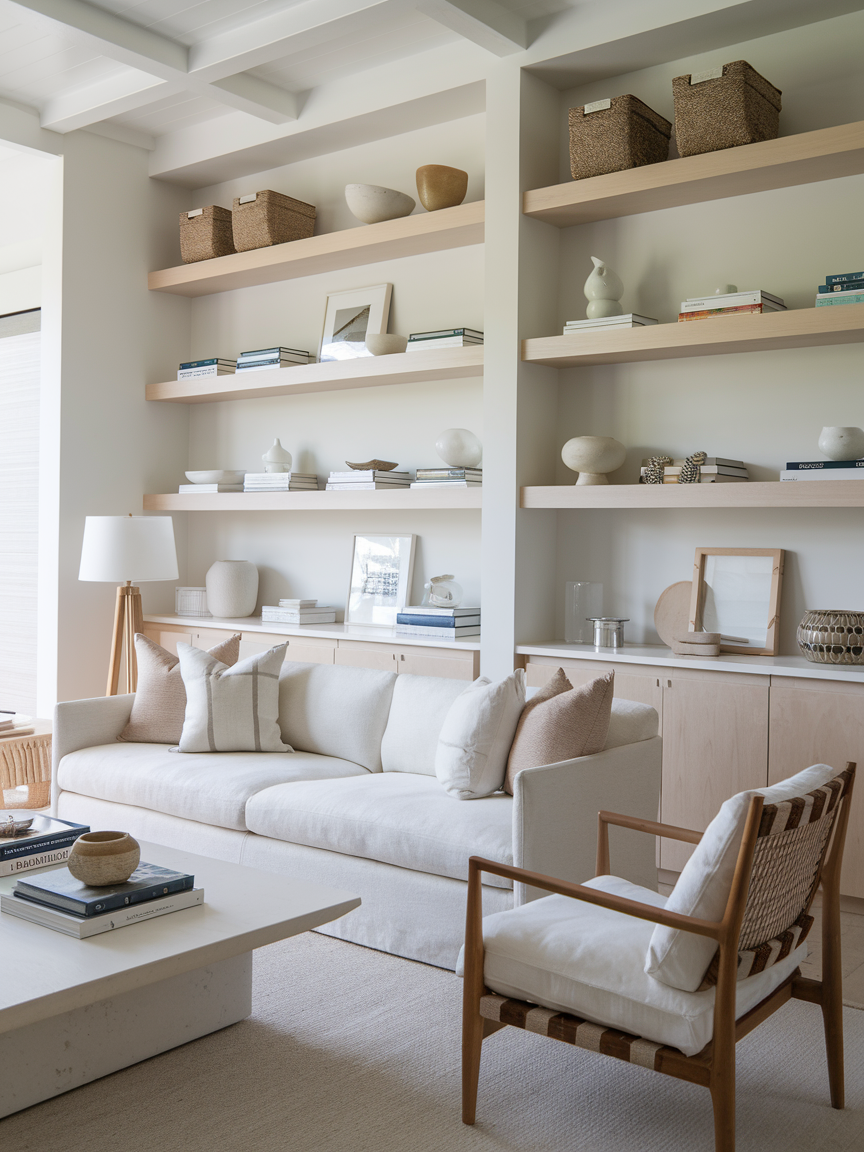 Open shelving offers an opportunity to display carefully curated décor while maintaining a light and organized appearance. Paint shelves in crisp white or soft neutral tones to blend seamlessly with the walls. Arrange books, ceramics, woven baskets, and small decorative objects in cohesive colors to create harmony. Leave intentional gaps between items to avoid overcrowding and preserve negative space. Mixing heights and shapes adds visual interest while keeping the arrangement balanced. The overall styling should feel effortless rather than staged. Open shelving enhances functionality while contributing to the relaxed coastal aesthetic, especially when paired with natural materials and subtle decorative accents.