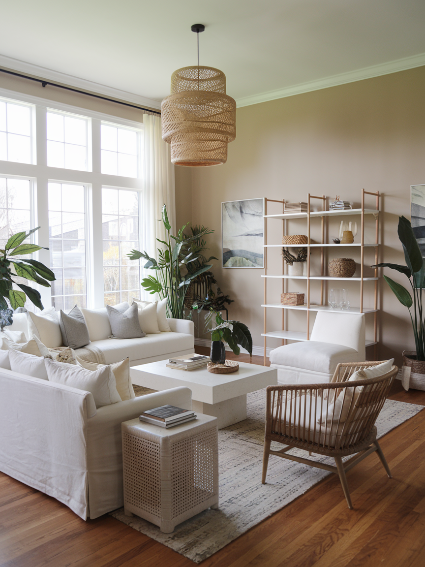 Rattan and woven materials introduce texture and depth without overwhelming the space. Consider rattan accent chairs, woven pendant lights, or baskets for storage. These elements bring warmth and a subtle tropical influence while maintaining a modern edge. Keep shapes simple and streamlined to avoid a traditional look. Woven textures pair beautifully with linen, cotton, and light wood, creating a layered yet breathable environment. These organic materials reflect coastal living in a refined way, adding dimension and tactile interest to the living room.
