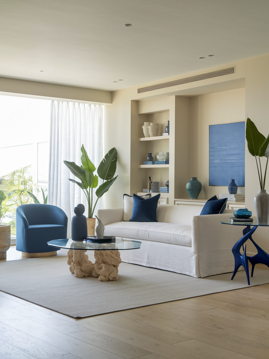 The final details in a modern coastal living room should emphasize harmony and simplicity. Soft throws draped casually over a sofa, neutral candles placed on a tray, and subtle artwork on the walls complete the space without overwhelming it. Every accessory should feel intentional and aligned with the overall palette. Avoid excessive layering or bold contrasts at this stage. Instead, focus on balance, proportion, and texture. Warm lighting enhances the cozy atmosphere, while carefully styled surfaces maintain a clean finish. When all elements work together cohesively, the living room radiates tranquility and effortless elegance. The ultimate goal is to create a space that feels fresh, serene, and welcoming—capturing the essence of coastal living in a modern and sophisticated way.