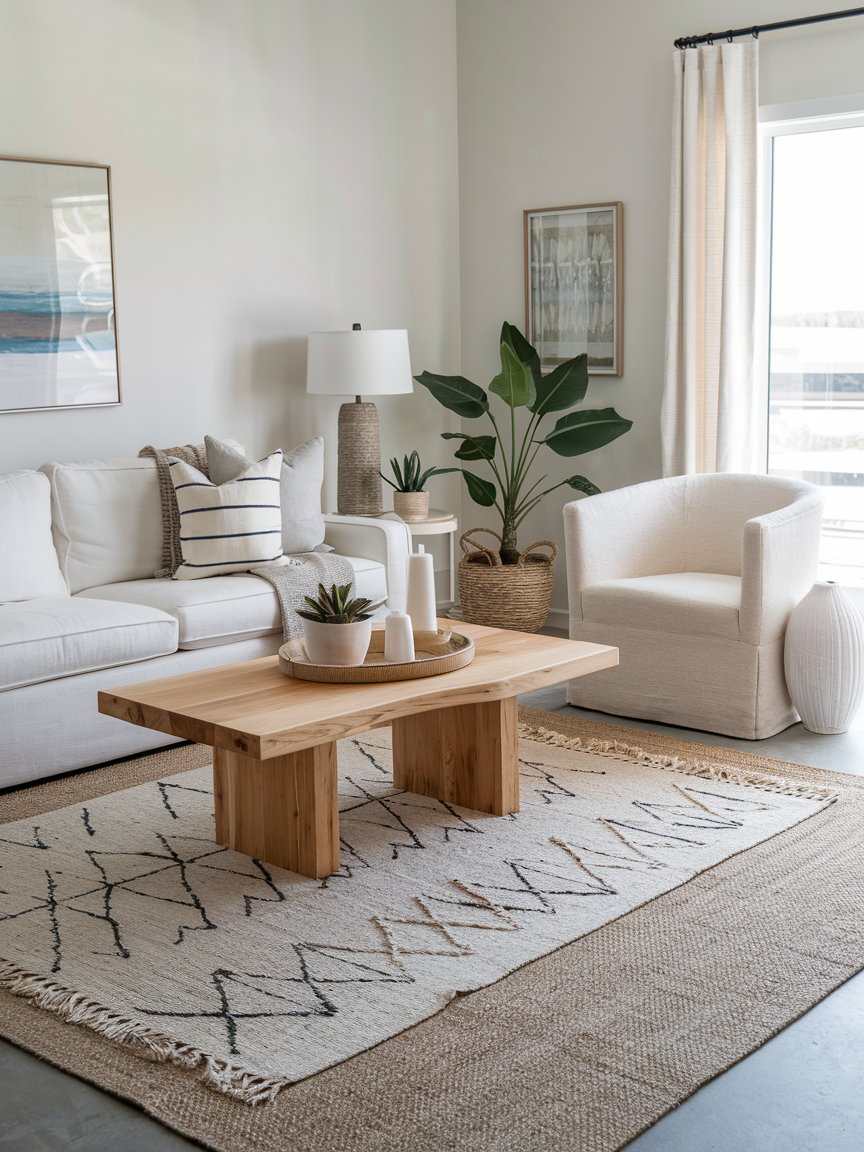 Incorporating natural wood coffee tables adds warmth and grounding to a modern coastal living room. Look for light oak, weathered finishes, or driftwood-inspired textures that echo the organic beauty of the shore. Clean lines keep the piece feeling contemporary, while visible wood grain adds character. A wooden coffee table balances crisp white upholstery and prevents the room from feeling too sterile. Style it simply with a ceramic vase, a stack of neutral books, or a small bowl of decorative shells. The contrast between soft fabrics and solid wood creates harmony and reinforces the natural, relaxed aesthetic.