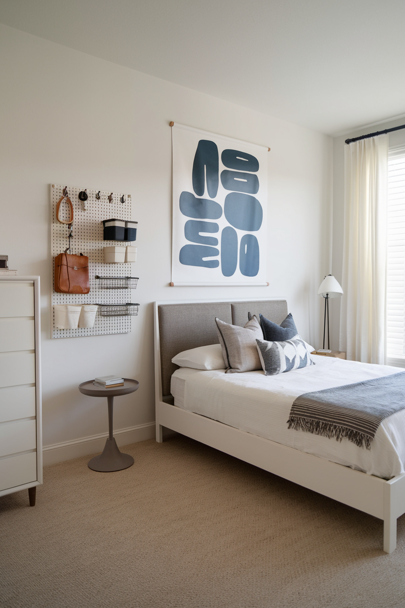 Pegboards aren’t just for the garage or craft room. Mount one on a blank bedroom wall and use hooks, baskets, or small shelves to store or display accessories, beauty products, keys, or other small essentials. You can rearrange the setup easily to accommodate changing needs, and you’ll be surprised how much function you can pack into a single vertical panel.