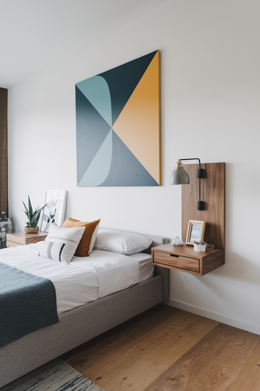 If floor space is too tight for a full nightstand, consider a floating alternative mounted to the wall. These mini platforms offer just enough room for a lamp, phone, and book, and they leave the floor open for other storage solutions, or simply create a cleaner, more open look. Some models even include small drawers or hidden storage for added function.