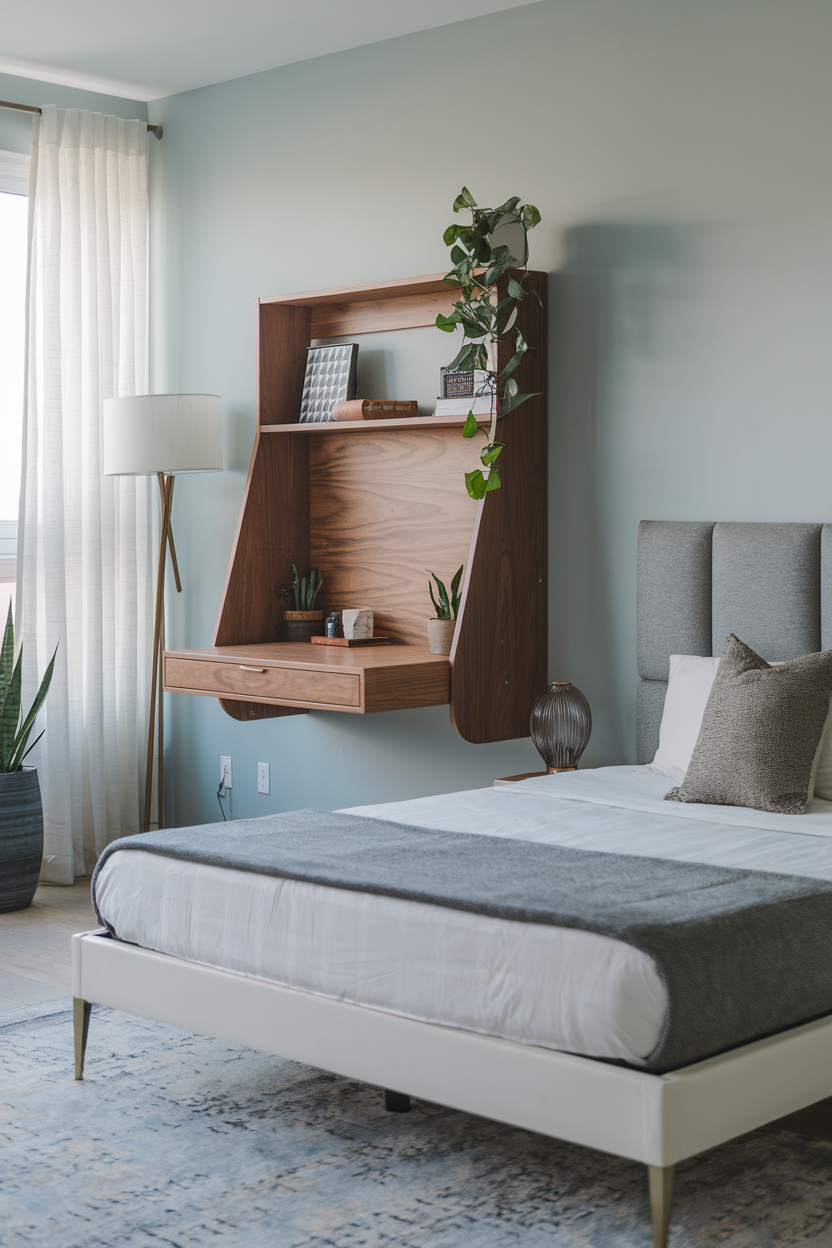 Traditional desks can eat up a lot of precious space, but a wall-mounted desk provides a sleek and practical alternative. Fold-down desks or floating shelves can serve as your workstation, vanity, or writing nook. When not in use, it folds back up, revealing either a flat panel or a stylish shelving unit. You get all the benefits of a desk without sacrificing valuable floor space, making it ideal for compact bedrooms or multipurpose areas.