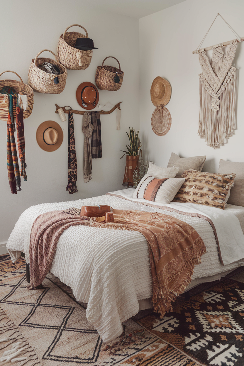 Wall-mounted baskets are perfect for small accessories like scarves, belts, hats, or even mail and notebooks. Install a few in a vertical column for an eye-catching display that keeps clutter off your surfaces and adds texture to your decor. Choose woven, wire, or fabric styles to match your bedroom’s look.
