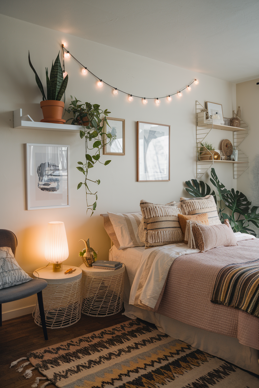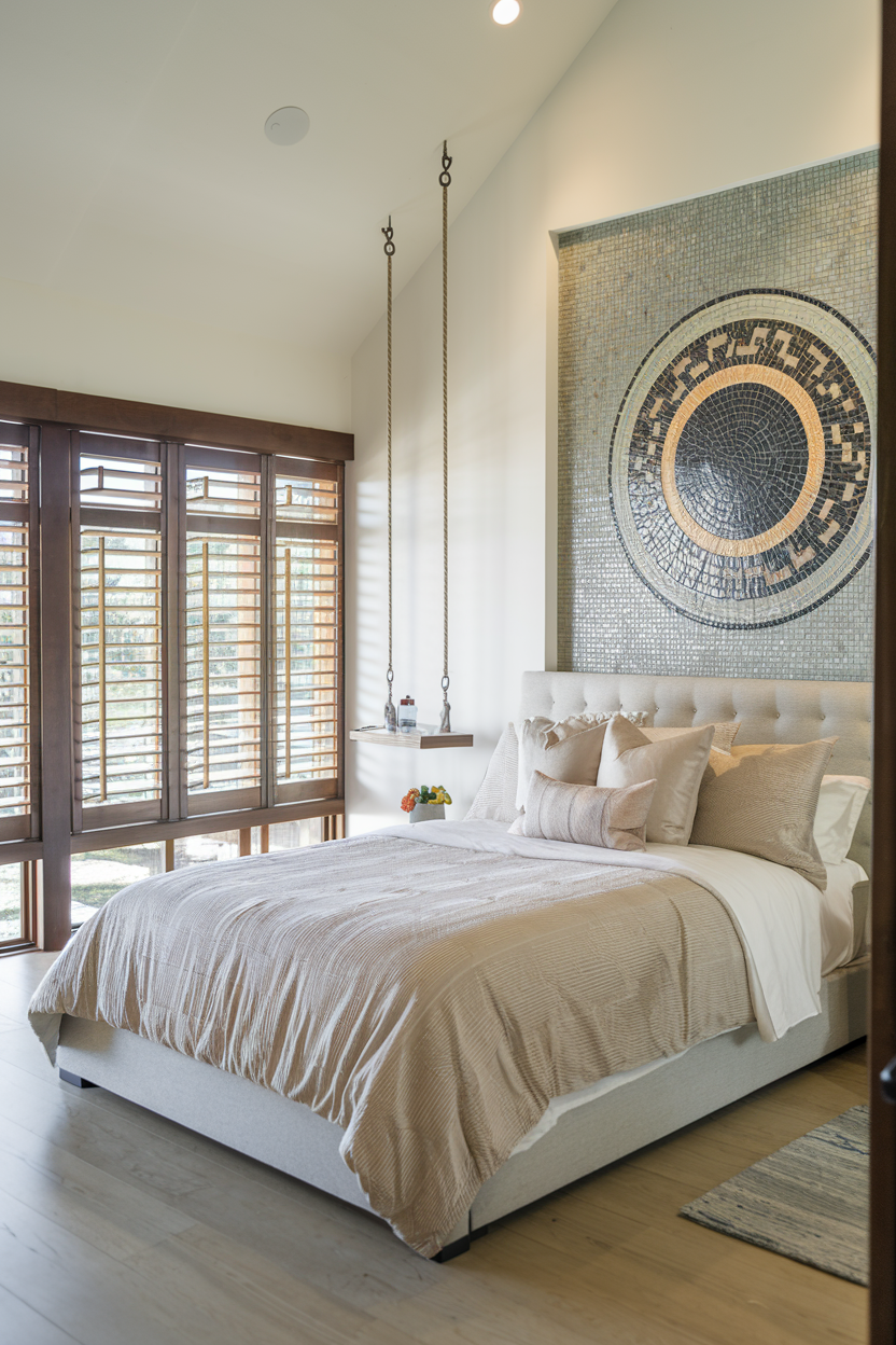If you don’t have space for a traditional nightstand, a hanging nightstand suspended from the ceiling or mounted to the wall by rope or chains can provide just enough surface area for essentials. It’s an eye-catching and creative way to add storage without taking up any floor space, and it adds a unique, boho-inspired charm to your bedroom.