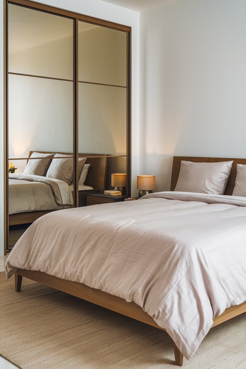 A mirrored wardrobe serves two purposes: storage and visual expansion. The mirrors reflect light and make your bedroom appear larger, while the interior offers space for clothes, accessories, and even hidden drawers. Choose a model with sliding doors for an extra space-saving boost.