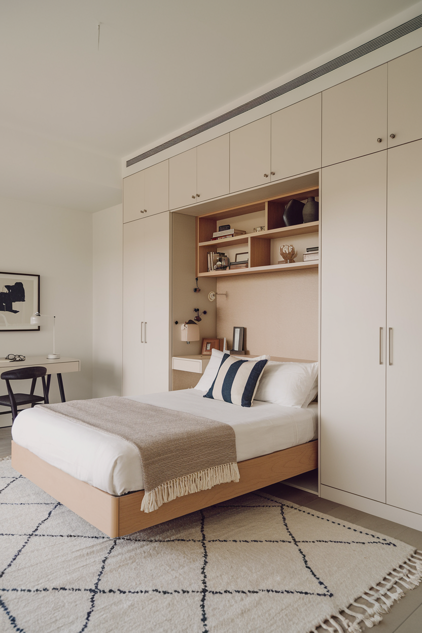 A Murphy bed (also known as a wall bed) folds vertically into a built-in wall cabinet when not in use, instantly freeing up floor space. These beds are particularly useful for studio apartments or guest rooms that double as offices. Modern Murphy beds often come with built-in shelves, desks, or couches, making them a multifunctional piece that’s as stylish as it is space-conscious.