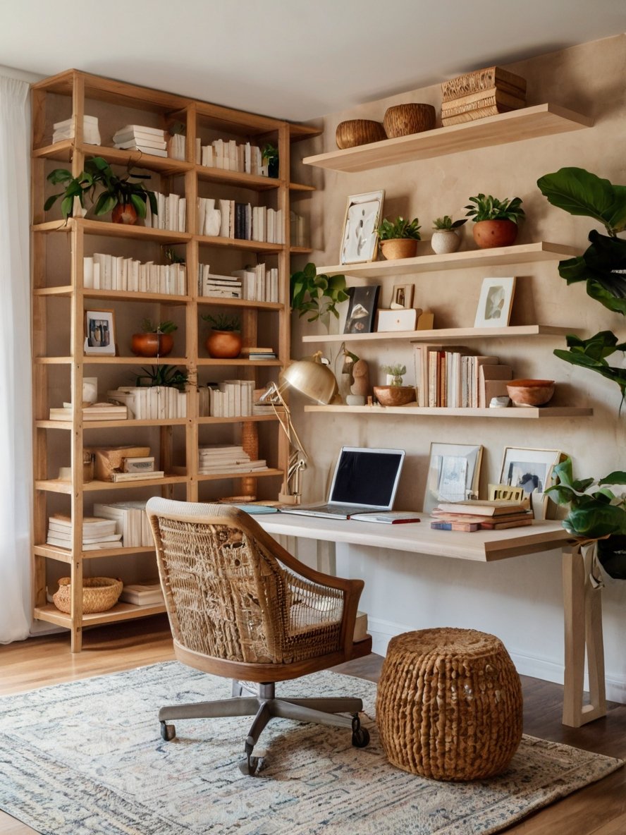 This boho home office is the perfect balance of functionality and aesthetic charm, offering a serene retreat for work and creativity. The warm wood tones, open shelving, and woven textures create an inviting atmosphere, while lush greenery breathes life into the space. The minimalist floating desk keeps the look airy and uncluttered, allowing the natural materials and earthy hues to shine. With carefully curated decor, cozy lighting, and a mix of organic elements, this workspace is both stylish and inspiring, ideal for productivity with a touch of tranquility.