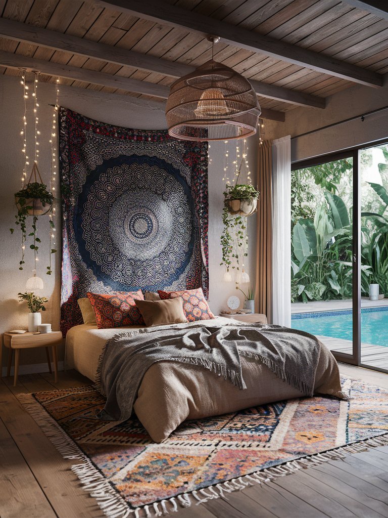 This boho-inspired bedroom is a serene retreat that feels like a private hideaway. The intricate tapestry, with its mesmerizing patterns and deep hues, adds an artistic and soulful touch, while the soft glow of fairy lights enhances the dreamy ambiance. Every detail in the space, from the rustic wooden ceiling to the woven pendant light, contributes to a warm and inviting atmosphere. The bed is layered with cozy blankets and textured pillows, creating the perfect spot to unwind. The sliding glass doors open to a stunning poolside view, seamlessly merging indoor comfort with outdoor tranquility. Whether for an afternoon nap or a restful night’s sleep, this bedroom offers the perfect blend of coziness and bohemian sophistication.