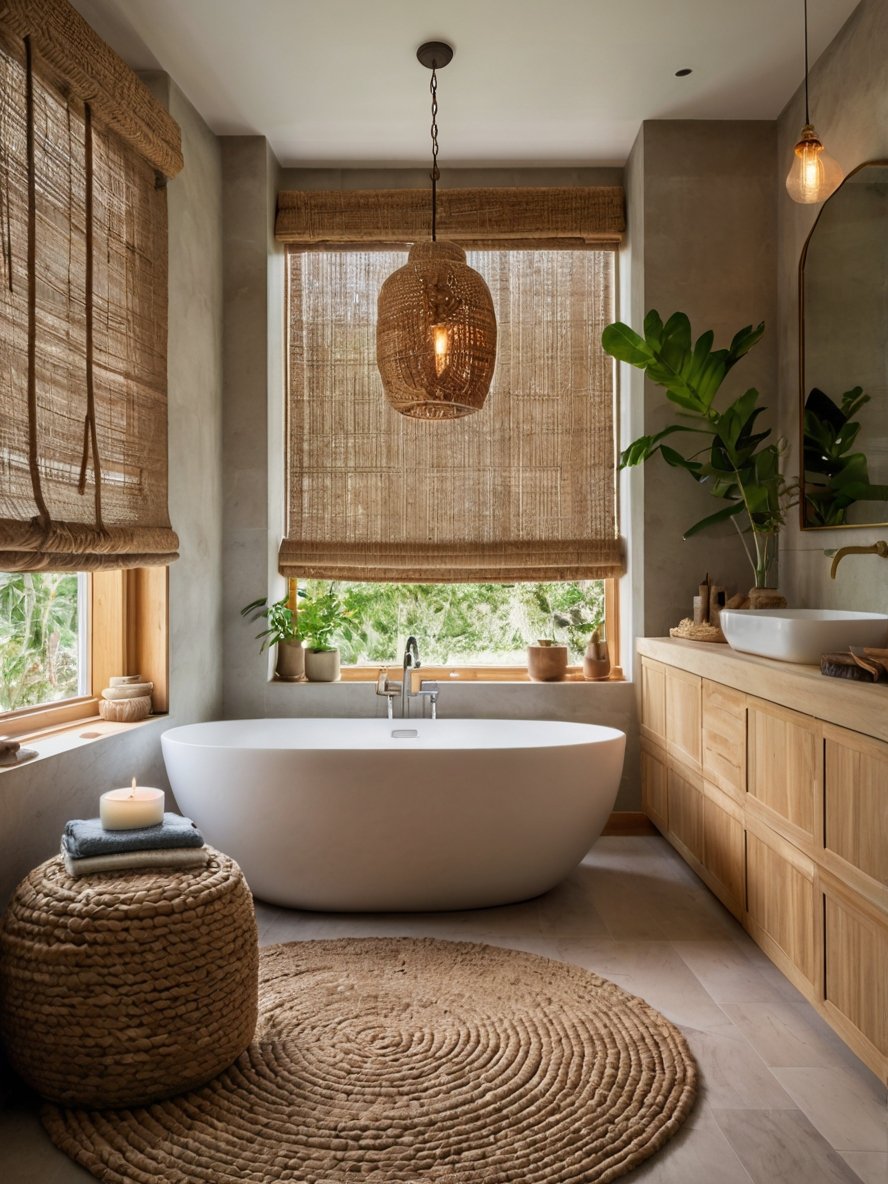 This bohemian bathroom embraces the beauty of natural materials and organic textures, creating a sanctuary of relaxation and style. The freestanding tub is the perfect focal point, framed by large windows that invite in soft, filtered light through woven shades. The wooden vanity adds warmth and elegance, while the mix of rattan and woven accents—seen in the pendant light, pouf, and textured rug—creates a layered, earthy aesthetic. Greenery strategically placed throughout the space breathes life into the design, enhancing the connection to nature. Whether it’s a morning refresh or an evening soak, this space offers the perfect balance of boho charm and understated luxury.