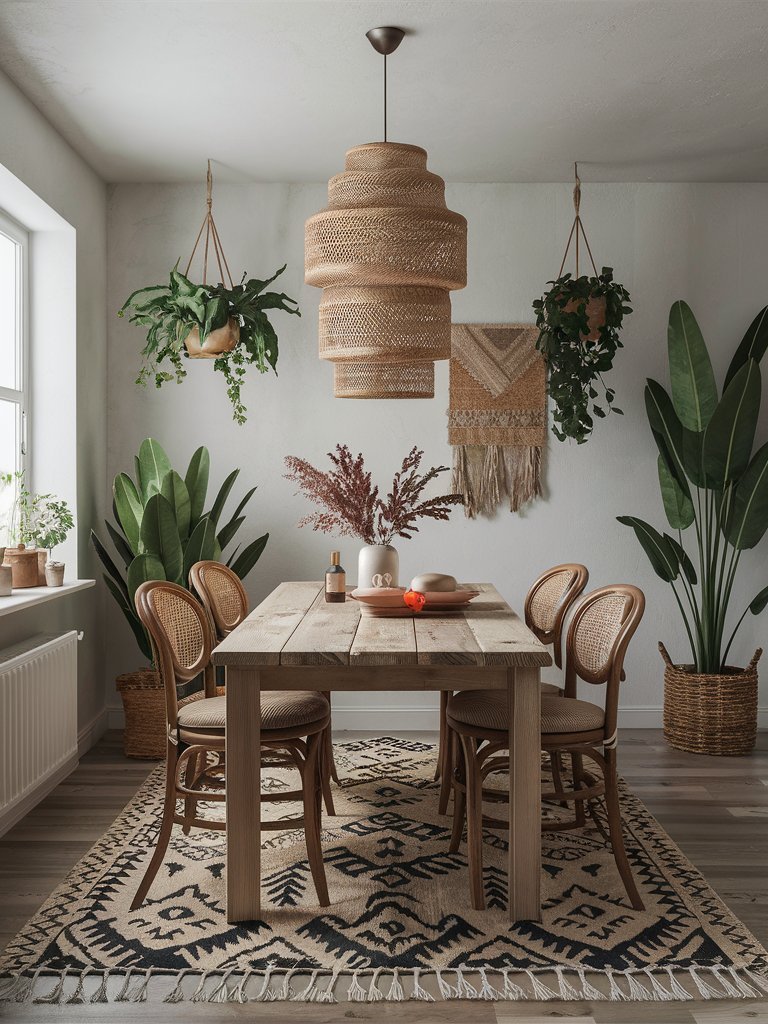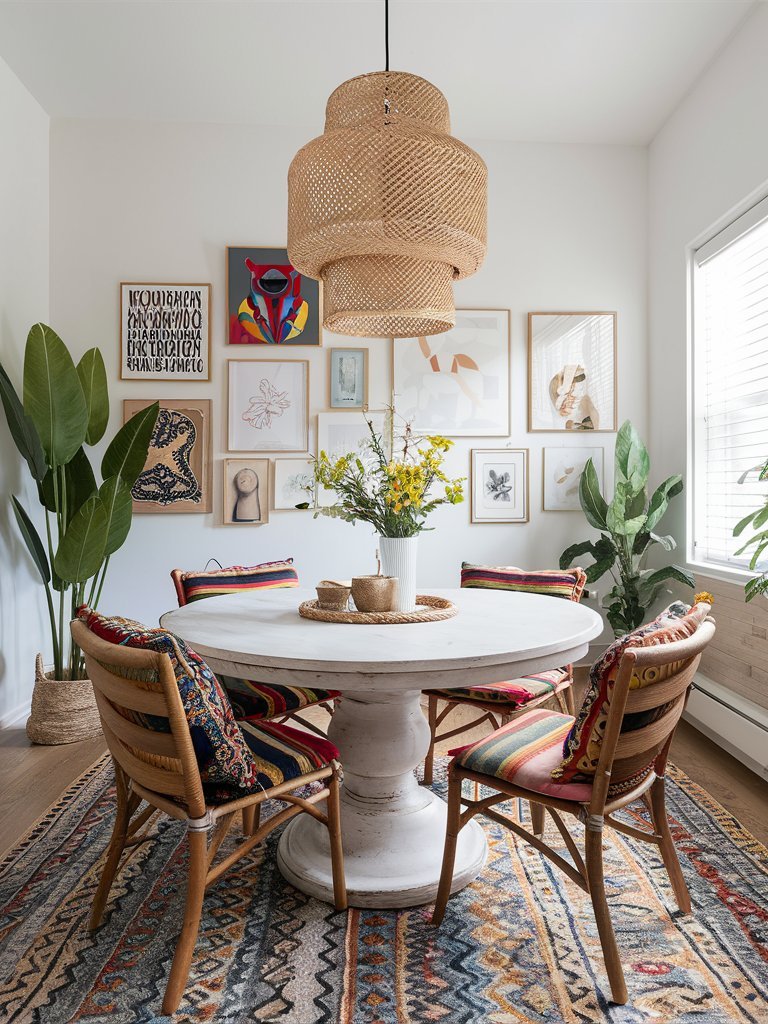 The gallery wall behind the dining set is a true statement, mixing abstract, modern, and typographic art in warm, neutral tones with pops of bold color. Layered over a textured rug with geometric patterns, the setup feels effortlessly curated yet full of life. Lush greenery, strategically placed near the windows, breathes freshness into the space, making this boho dining room an inspiring and comfortable gathering spot with an artistic soul.