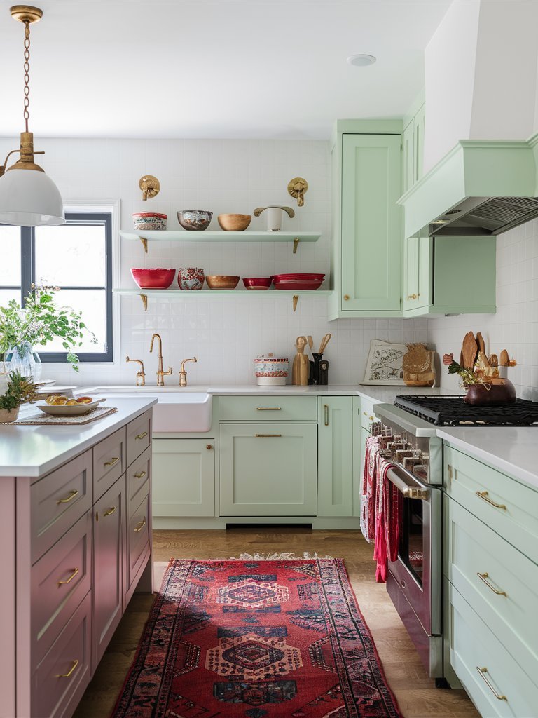 This kitchen is a breath of fresh air, blending soft pastel tones with bold, global-inspired accents. The mint-green cabinetry exudes a fresh, airy feel, while gold hardware and brass fixtures add a touch of elegance. Open shelving allows for a curated display of handcrafted bowls and warm-toned ceramics, bringing a personal touch to the space. The white subway tile backsplash keeps the look clean and modern, providing a neutral canvas for the pops of color throughout. A vintage-inspired red Persian rug grounds the space, adding warmth and depth. The mix of old and new, soft and bold, creates a boho-chic kitchen that feels both stylish and welcoming.