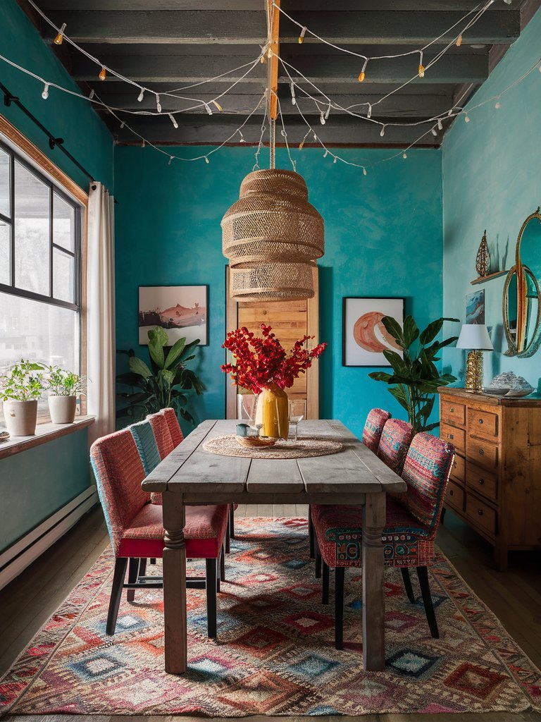 This dining room is a bohemian dream, where vibrant colors and natural textures come together in perfect harmony. The rustic wooden dining table provides a sturdy, grounding element, while the beautifully patterned chairs add a burst of personality and artistic flair. The deep turquoise walls set a dramatic yet inviting tone, complemented by the warmth of wooden furniture and the organic charm of woven lighting. The patterned rug beneath creates a layered, well-traveled aesthetic, making the space feel effortlessly curated. String lights overhead add a soft, ambient glow, making every meal feel like a special occasion. With its rich colors, textures, and earthy elements, this space is designed for both comfort and creativity.