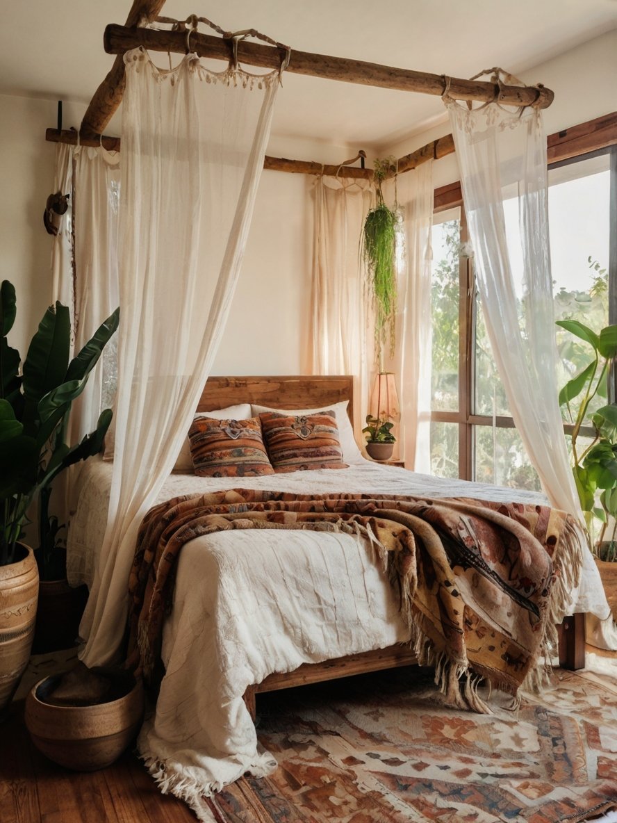 This boho bedroom is a sanctuary of tranquility, where natural textures and warm, earthy tones create a space that feels effortlessly serene. The rustic wooden canopy bed, adorned with sheer flowing curtains, sets the scene for a dreamy escape. Soft, layered textiles in neutral and earthy hues add warmth, while tribal-patterned pillows and a vintage rug bring a touch of global inspiration. The natural light filtering through large windows enhances the organic ambiance, making the room feel open and connected to nature. Lush greenery completes the look, reinforcing the calming, earthy aesthetic. This space is a perfect blend of rustic charm and bohemian luxury—an ideal spot for unwinding in style.