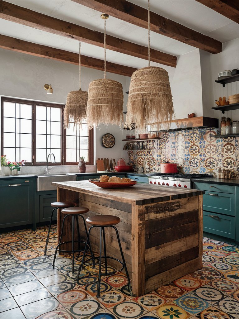 This boho kitchen is a bold and inviting space, brimming with rich textures and vibrant patterns. The striking combination of patterned tile flooring and a matching backsplash infuses the room with a lively, global-inspired charm, while the deep green cabinetry adds depth and contrast. The rustic wooden island, paired with industrial-style stools, grounds the space with an earthy, well-worn appeal that feels both stylish and practical.